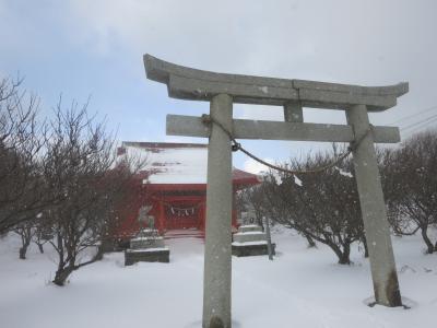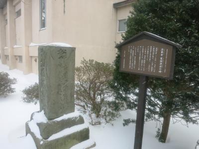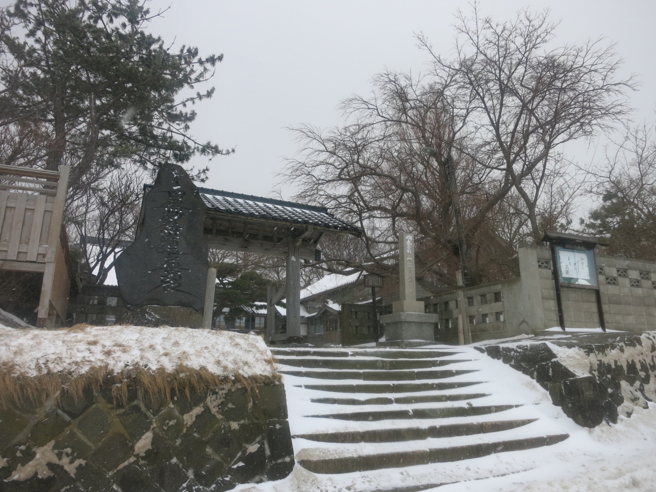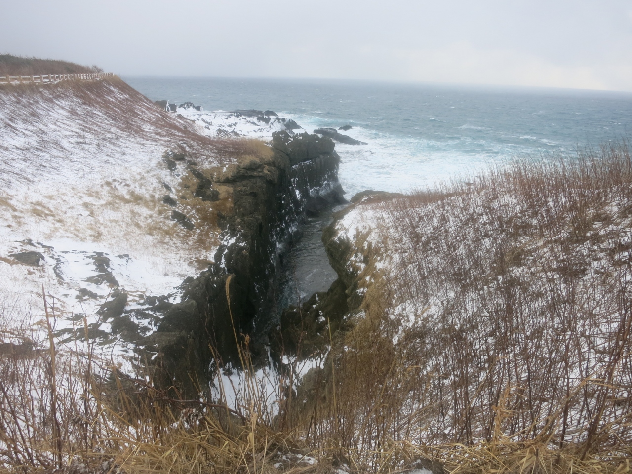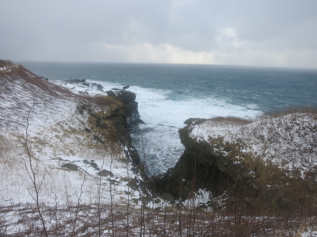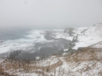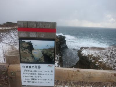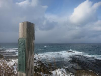 珍しいものを見たと満足げな足取りで次に向かったのは島の台地の上でした。階段を上ると、そこは海からの風が容赦なく吹き付け、白い雪が跳飛ぶ荒涼とした世界がありました。遊歩道の周囲には、追分記念碑、厳島神社、箱館戦争時の砲台跡(テカエシ台場跡、キネツカ台場跡)などがあります。そして島の西側に差し掛かった辺りです。思いがけず広大な景色が広がったのです。千畳敷でした。磯の岩場には日本海の荒波が打ち付け、岩場の黒に波しぶきの白が映えて、その荒々しさに一層拍車がかかっていました。まさに冬の日本海。時々吹雪いて視界は真っ白になりますが、雰囲気の演出には一役買ってくれます。週刊読売選定、新日本百景の柱が建っていました。夕日の風景を言っているのかもしれませんが、冬の悪天候も岩場の荒々しさが引き立ってなかなか良かったです。