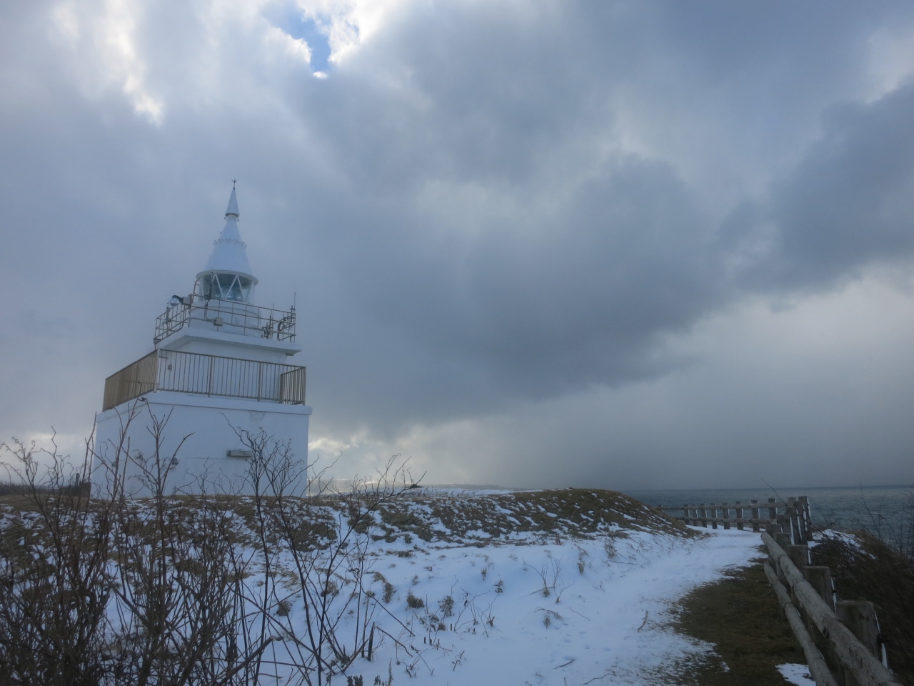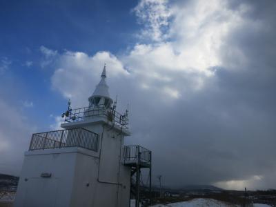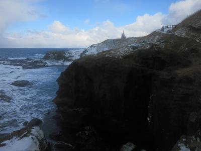 訪れたのは冬。時々、吹雪模様となる強風吹き荒れる中、台地の上を周遊しました。荒々しい岩場に雪が降り積もり、打ち付ける白波の様子がとても迫力がありました。通常でしたら、灯台は夕日の名所のようです。島の入口の看板にも夕日の展望灯台と銘打ってありました。ただ、冬の日本海の荒波もなかなかです。灯台には、低いものの展望台も付いていました。- 旅行時期