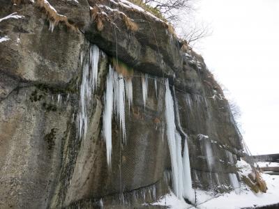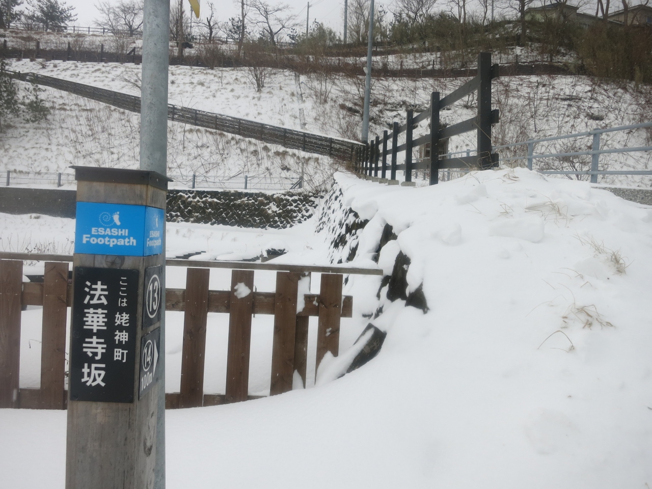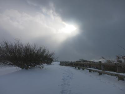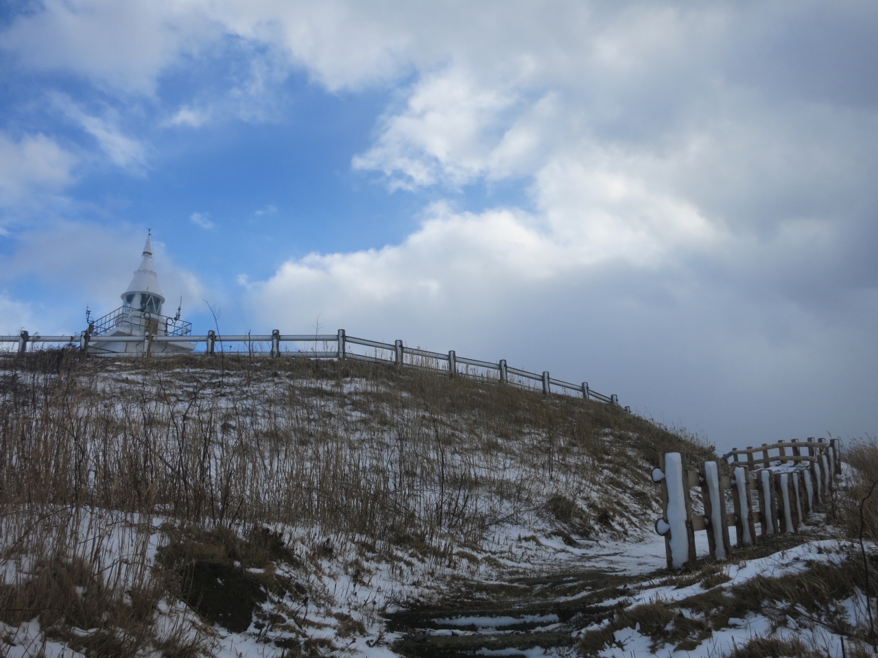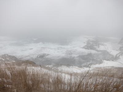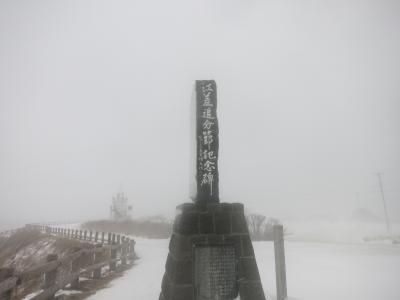 ところが訪れたのは真冬の1月。寒風吹きすさぶ天気の悪い日で、時々、吹雪模様になるなど、手足もかじかむ寒さでした。高台の休憩処も冬季休業のようで閉まっており、高台からの景色も江差の街並みや上ノ国方面も雪で薄ぼんやりしたり、全く見えなくなったりとあまり条件の良い日とは思えない日のはずでした。