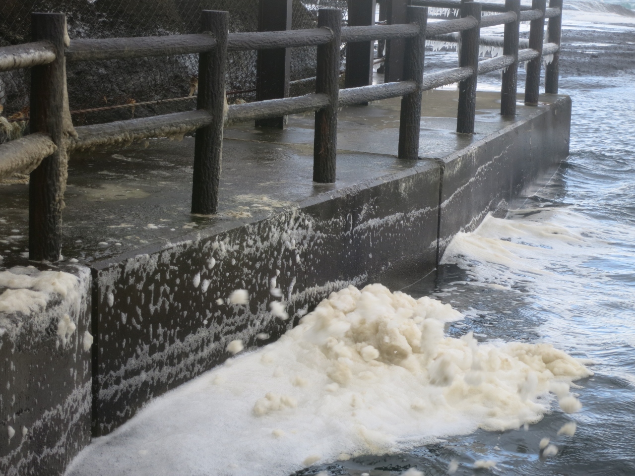 しかしそれはあったのです。かもめの散歩道のちょうど、防波堤を越えた辺りでした。強い北西の風を受けてザブザブと絶え間なく打ち寄せる波も、遊歩道のところへは磯の岩場に遮られて、あまり強く打ち寄せてきません。わずかに出来た幾らか穏やかな間隙に、波で生じた泡が集まっています。まるで綿の塊がホコホコ揺れているようです。それが一時の強風を受けてポポポーっと飛び立ちました。波の花です。初めて見た実物でした。