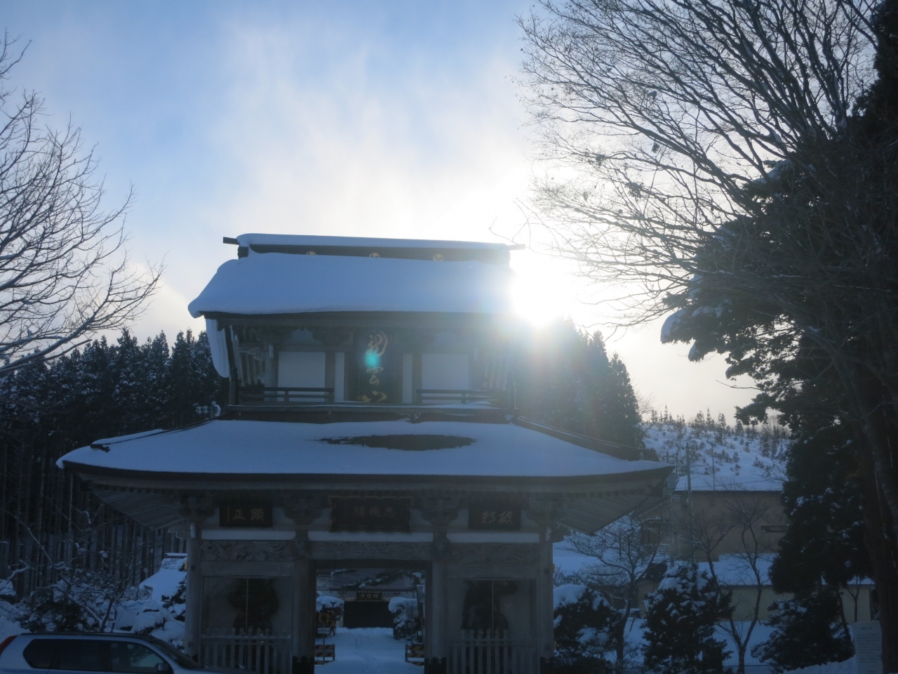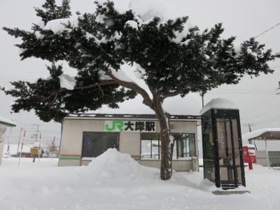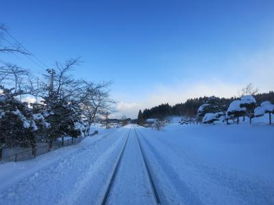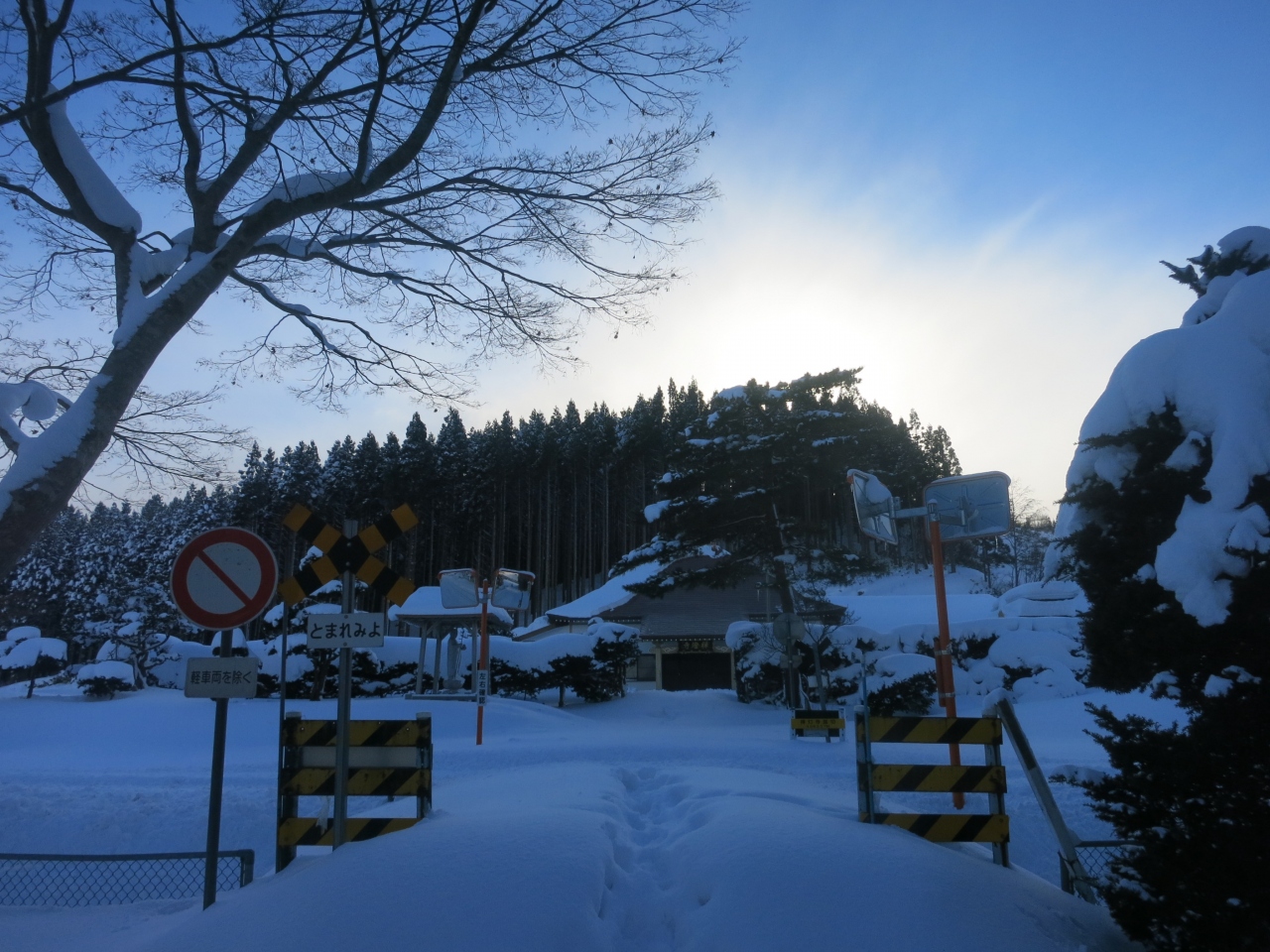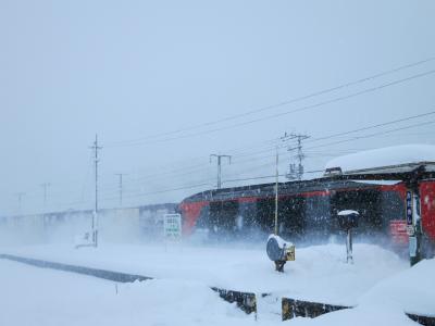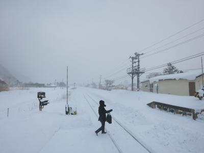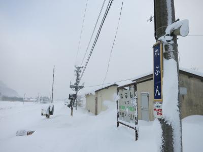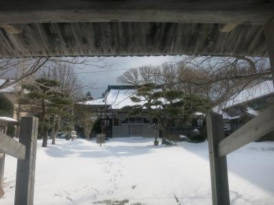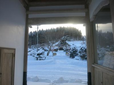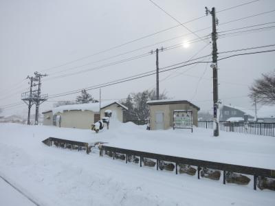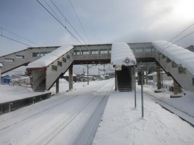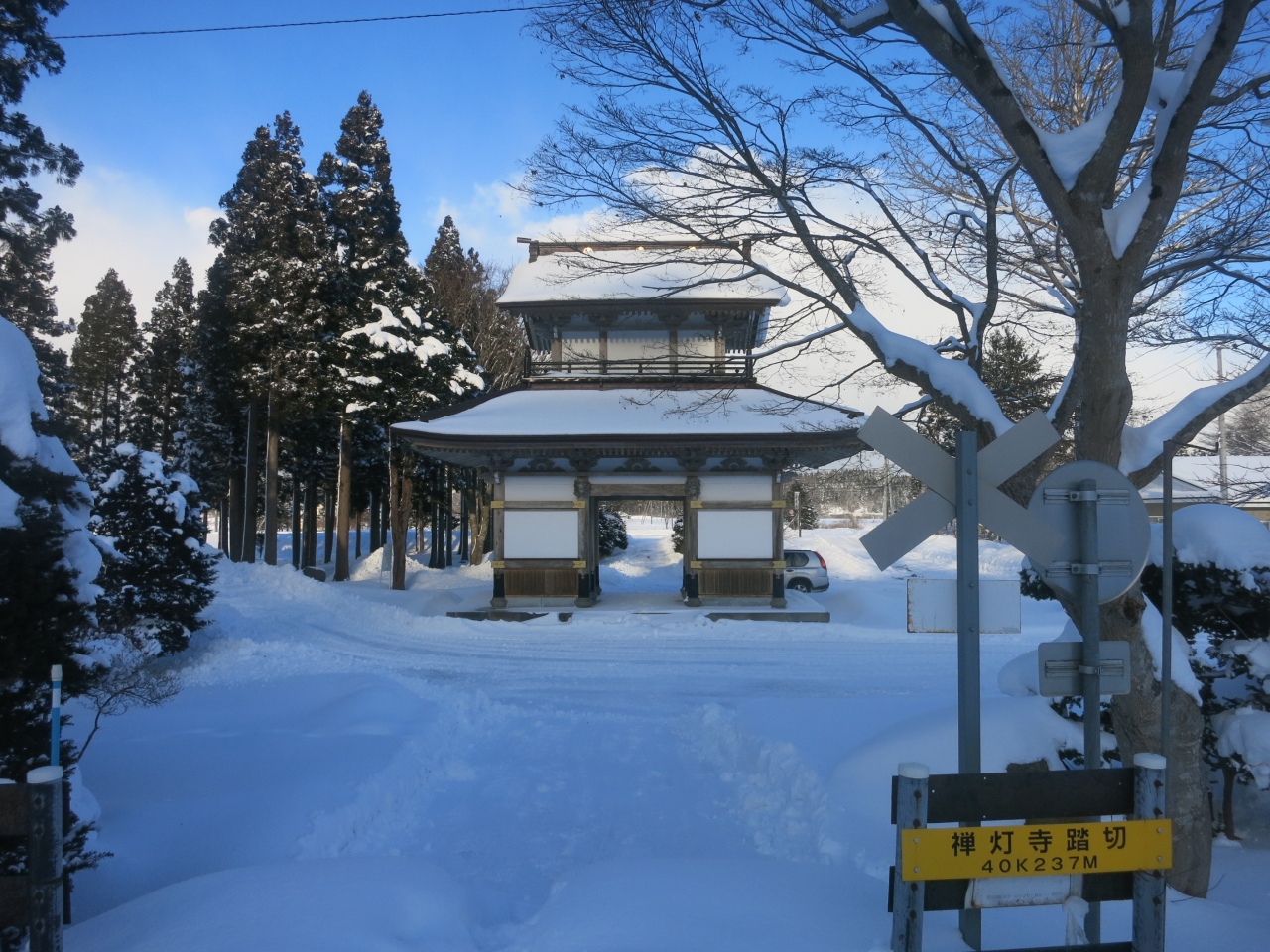 山門の隙間から見える列車は、駅を発車したばかり、または到着のため減速しているとはいえ、一瞬です。シャッターチャンスはわずか。更に、運行本数も少ないため、貴重な瞬間です。廃止される2014年5月に向けてカメラを構えた鉄道ファンなどが増えていきそうです。ただ、訪れた際には(2014年1月の、とある平日の午後)には、もう一人、訪れていた程度でした。線路は除雪されていたものの、踏切を渡る道には足跡もなく、腰まで埋まりそうな雪が、深々と積もっていました。- 旅行時期