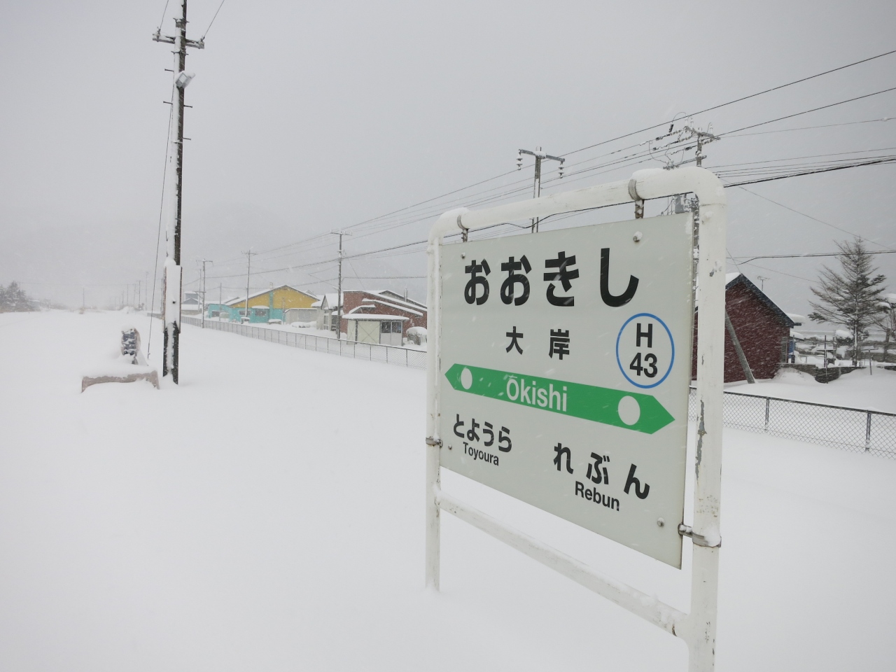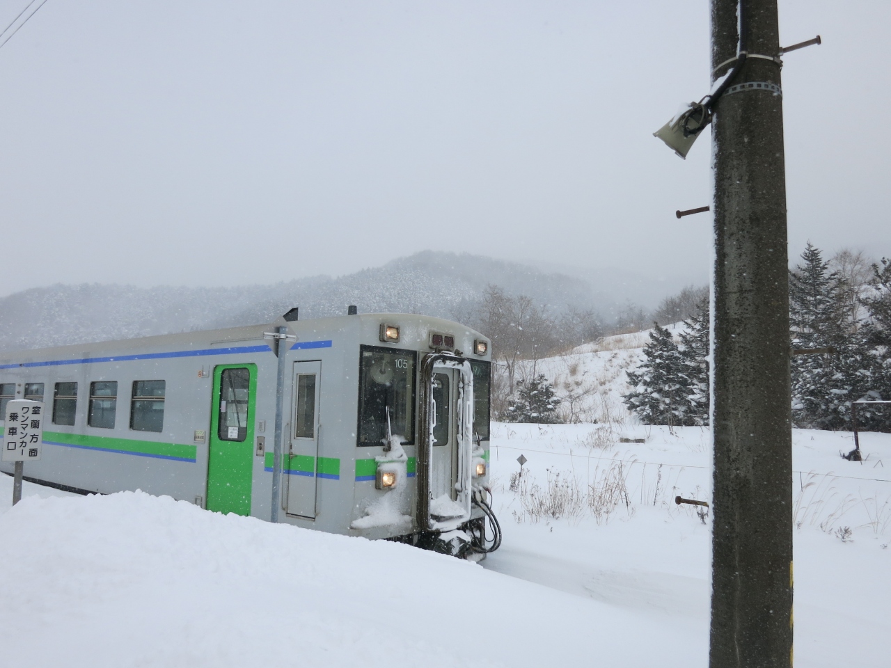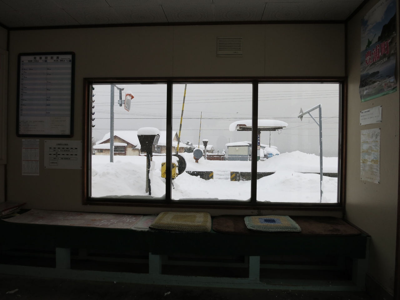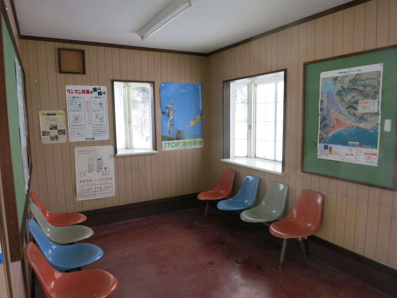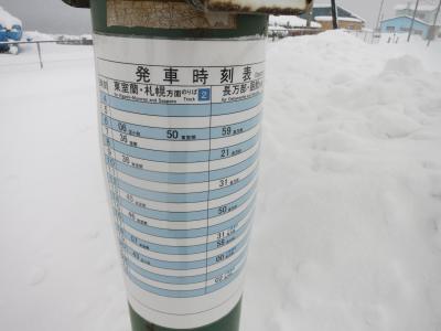 駅の目の前には1軒、商店があり、道道608号線沿いに集落の家並みもありますが、国道37号線(長万部~室蘭を結ぶ主要道)から1km以上離れていることもあり、閑散としています。待合室は暖房もなく、冬の長時間の列車待ちは大変です。1日8往復ほどの普通列車が停車します。時間帯にもよりますが、昼など、2~3時間に1本になるときもあります。特急や貨物列車の方が多く通るような感じがします。