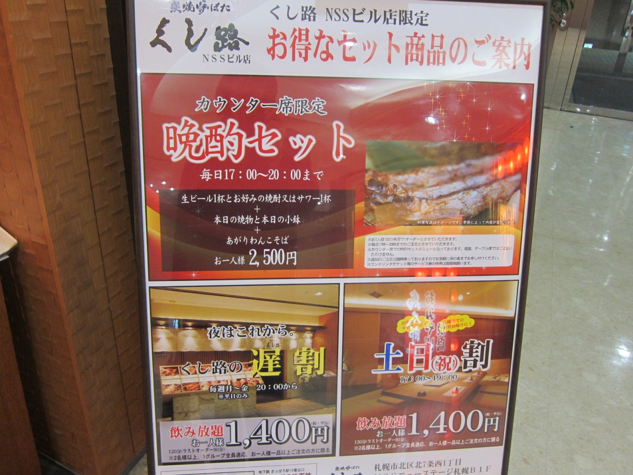 札幌駅北口または地下1階の東口から徒歩2、3分の商業施設ビル「NSSビル」の地下にあります。