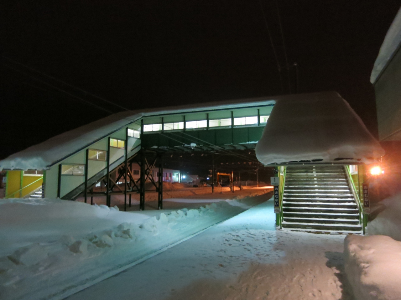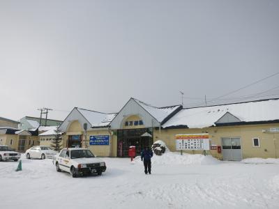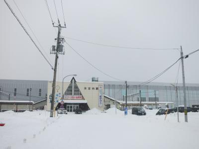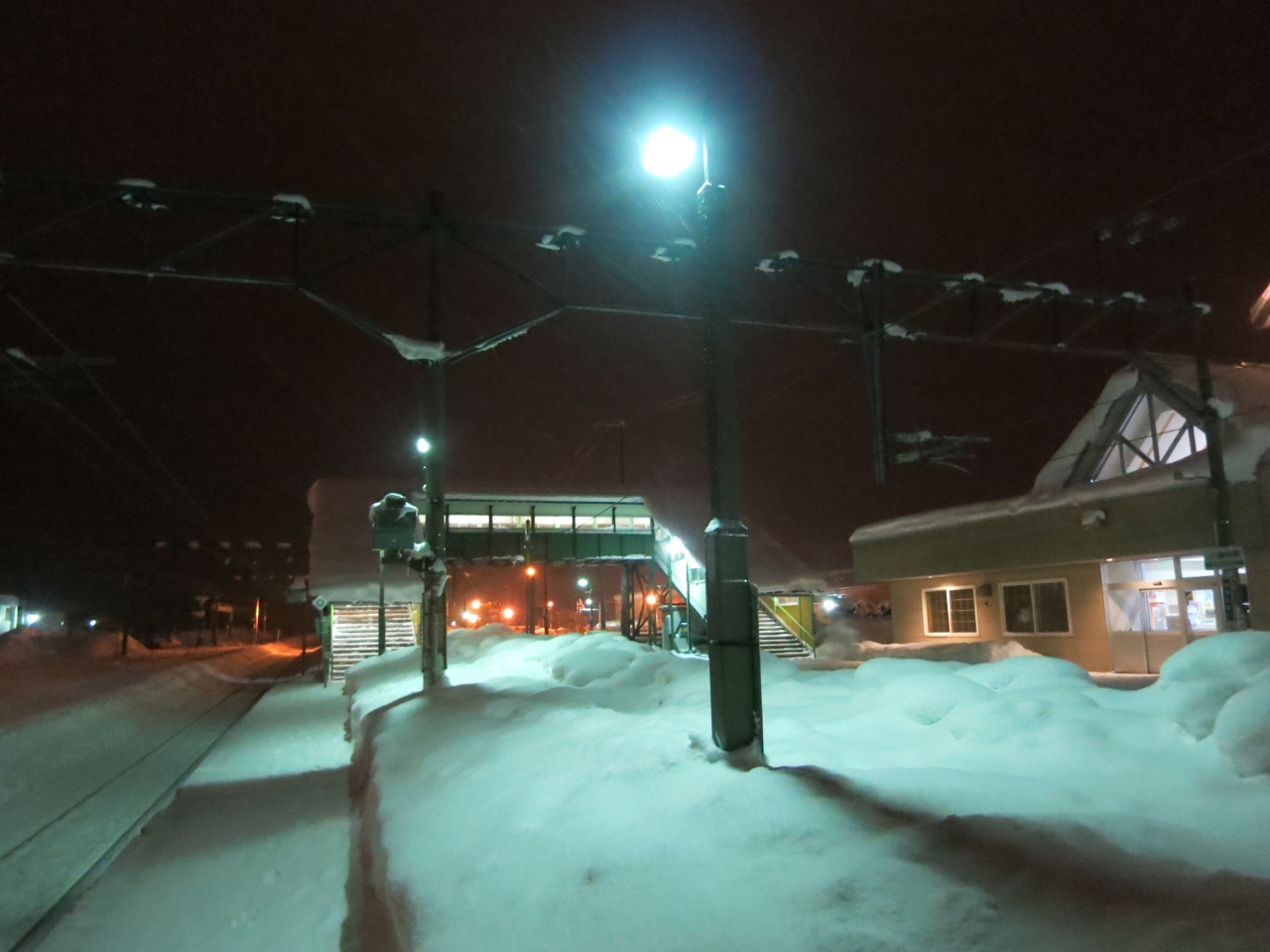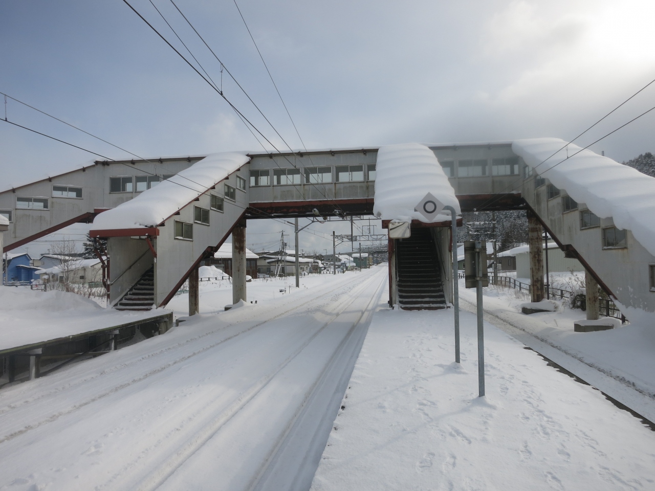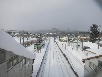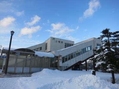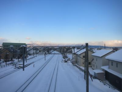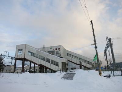 駅は片側ホームと島式ホームがあり、札幌・岩見沢・深川方面へは駅舎からすぐの片側ホーム。旭川方面へは跨線橋を渡り1面しか使われていない島式ホームから乗ります。冬は狭い幅しか除雪されておらず、ホームにも深々と雪が積もっています。