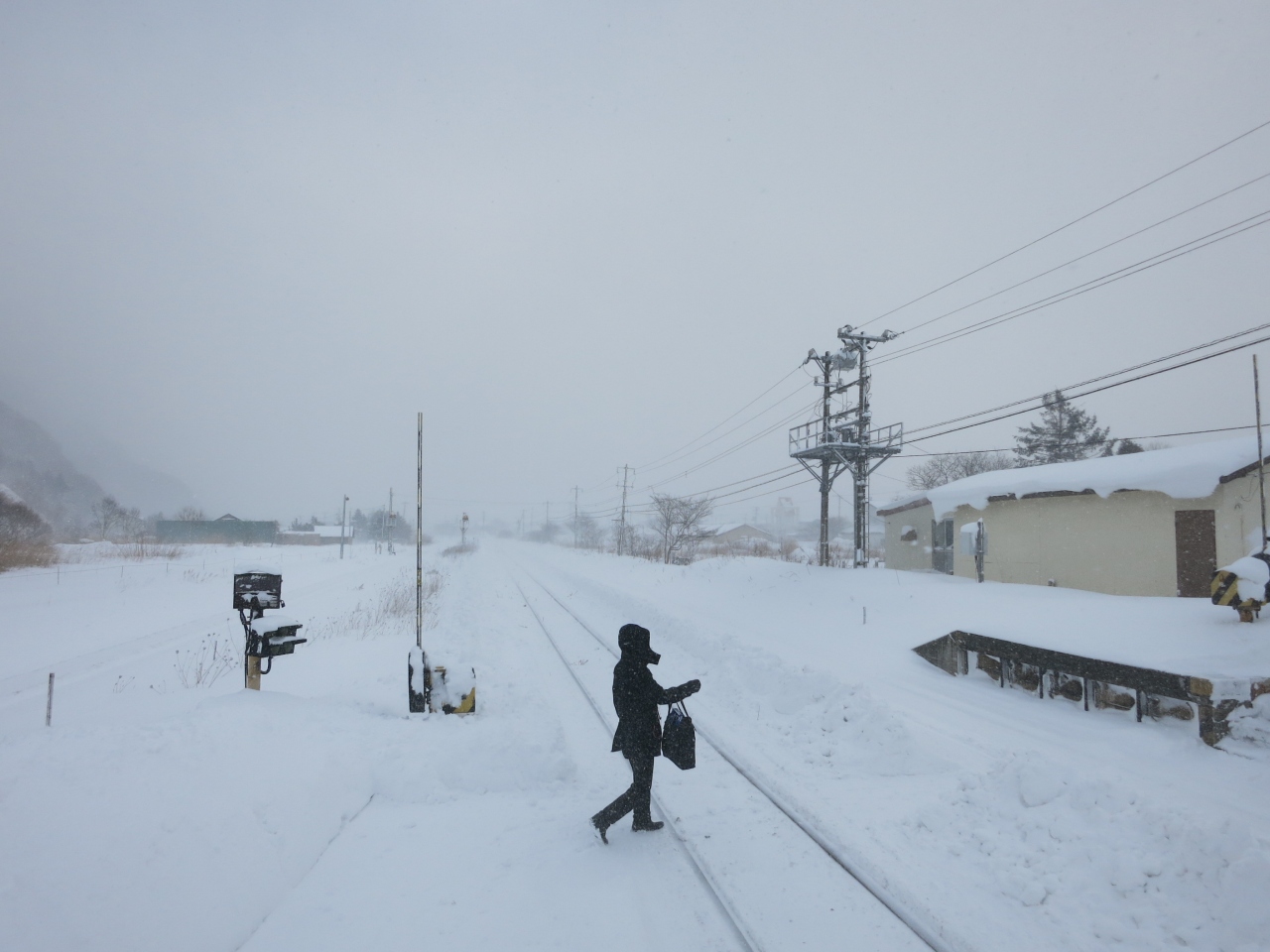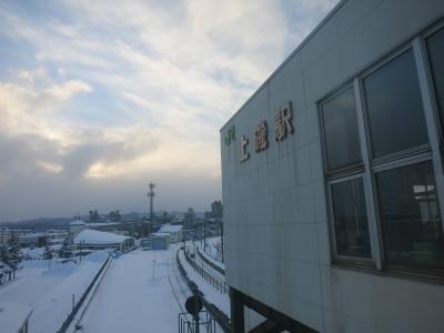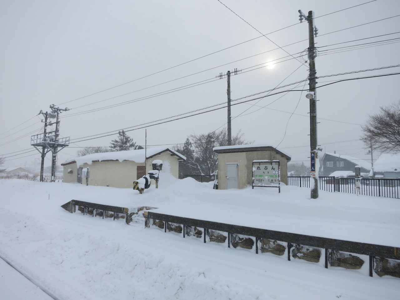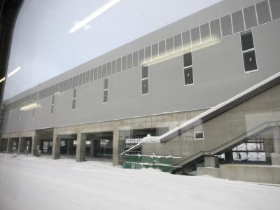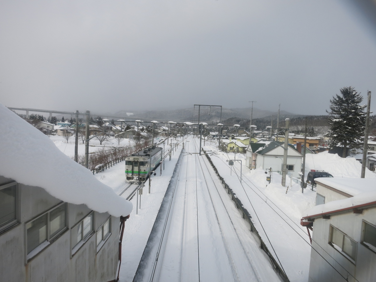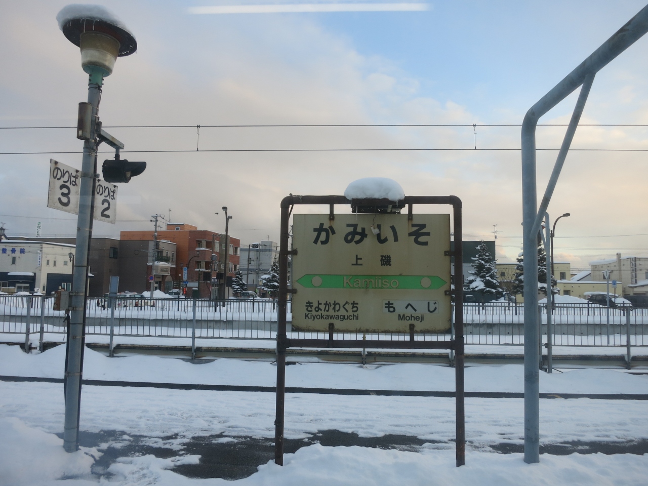 駅は片側ホームと島式ホームがあり、札幌・岩見沢・深川方面へは駅舎からすぐの片側ホーム。旭川方面へは跨線橋を渡り1面しか使われていない島式ホームから乗ります。冬は狭い幅しか除雪されておらず、ホームにも深々と雪が積もっています。