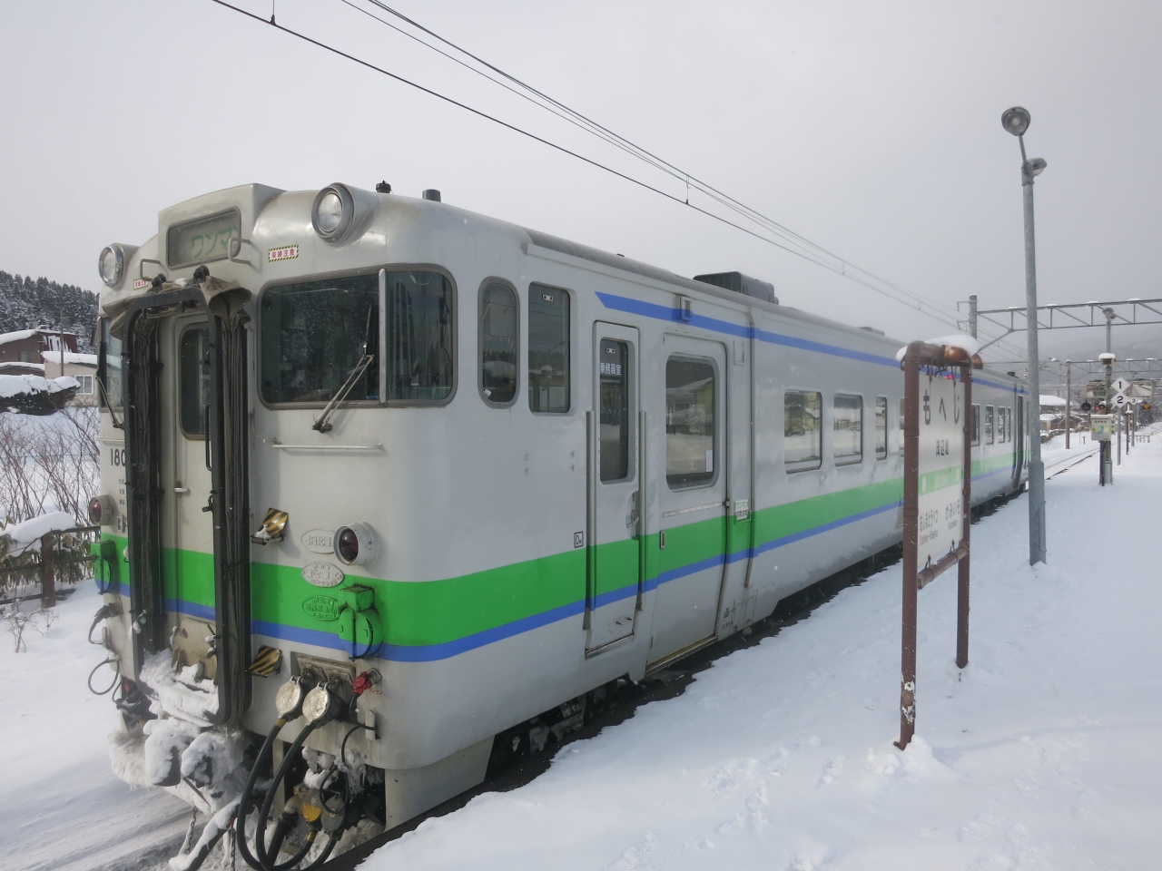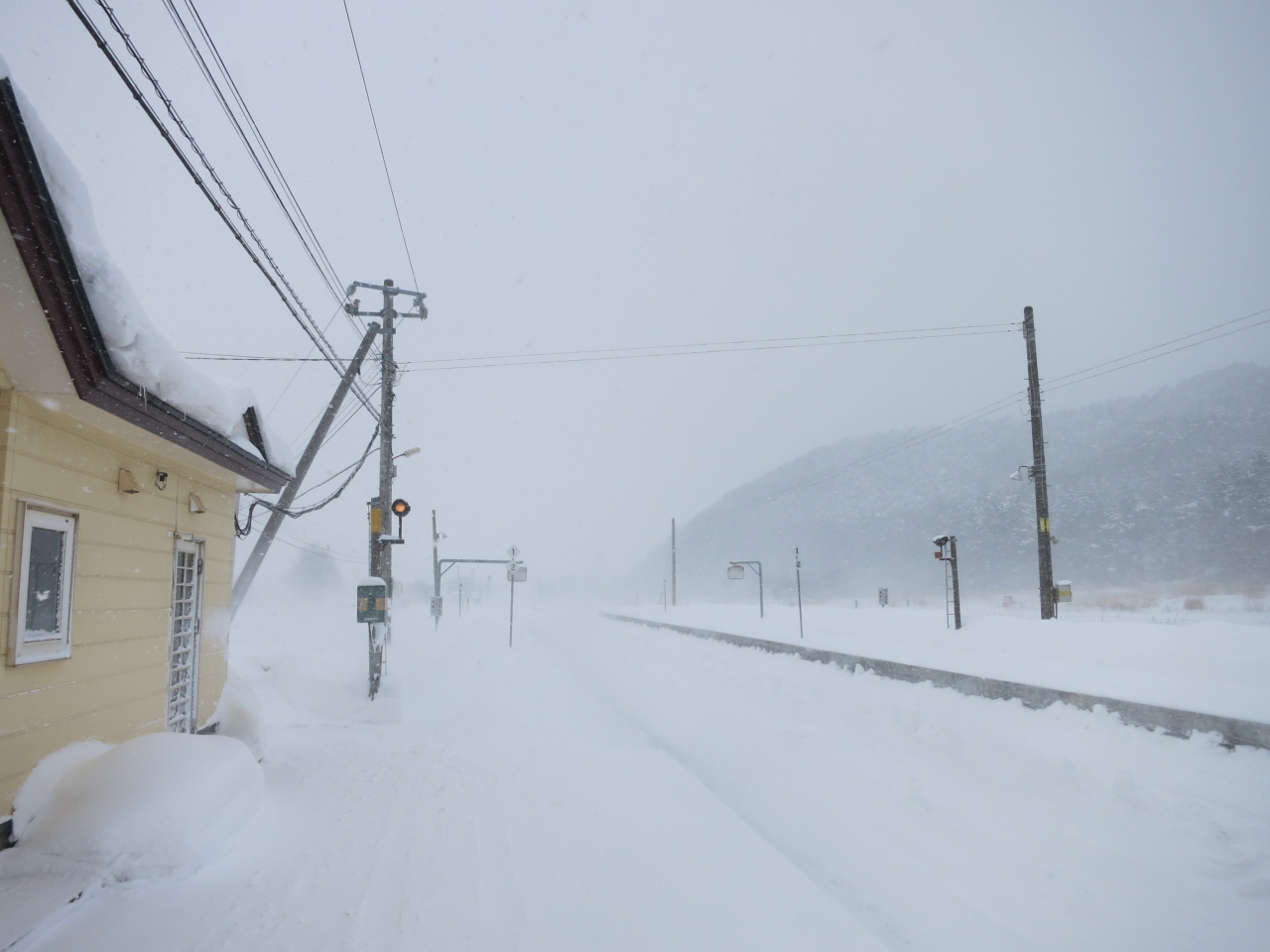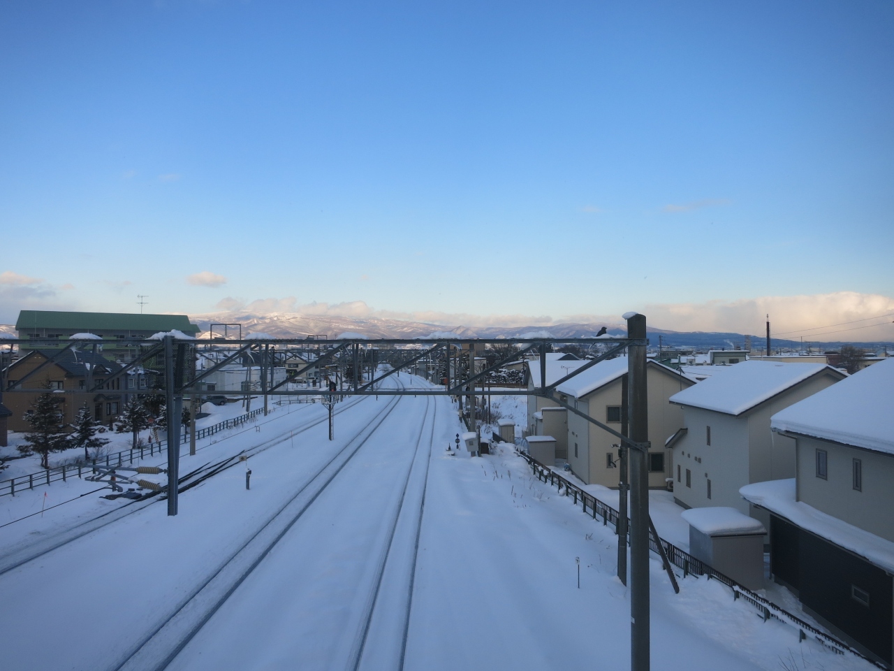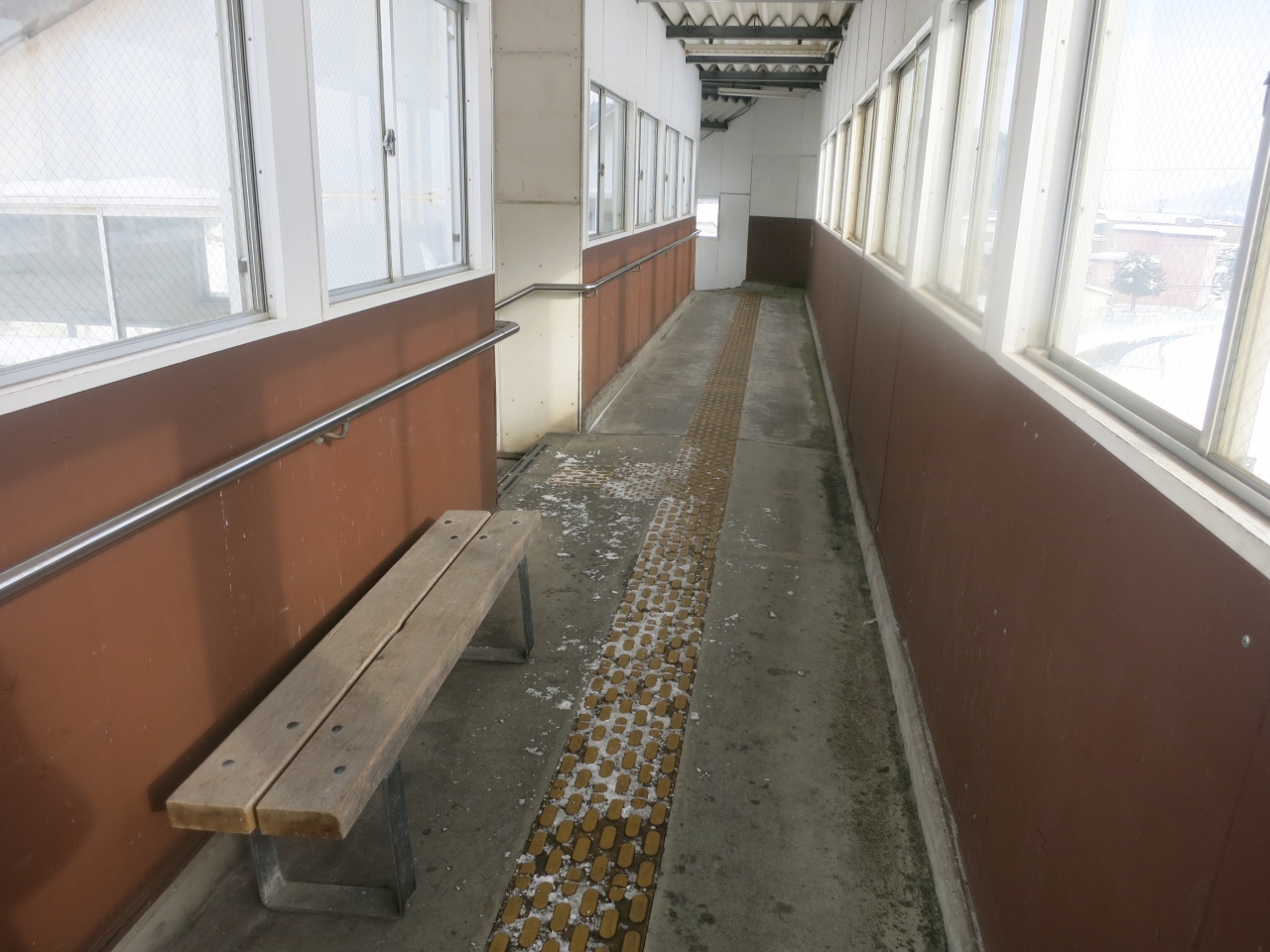 駅は片側ホームと島式ホームがあり、札幌・岩見沢・深川方面へは駅舎からすぐの片側ホーム。旭川方面へは跨線橋を渡り1面しか使われていない島式ホームから乗ります。冬は狭い幅しか除雪されておらず、ホームにも深々と雪が積もっています。
