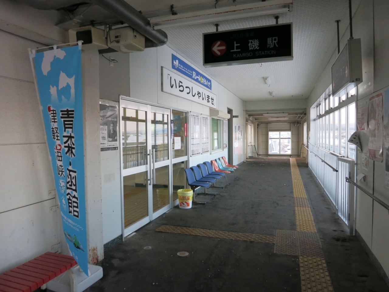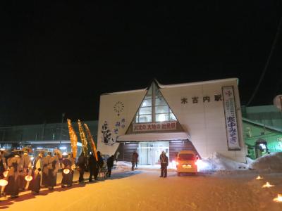 木古内は1月中旬に行われる寒中みそぎのイベントがありますが、駅正面にもその絵が描かれています。駅前の通りを500mほど行ったみそぎの浜と、駅裏500mほどの佐女川神社で行われますが、2日目のみそぎ行列が駅の跨線橋を通って、みそぎ広場から神社までを行進します。みそぎを行う行者が行列に加わるのは3日目ですが、駅は通りません。