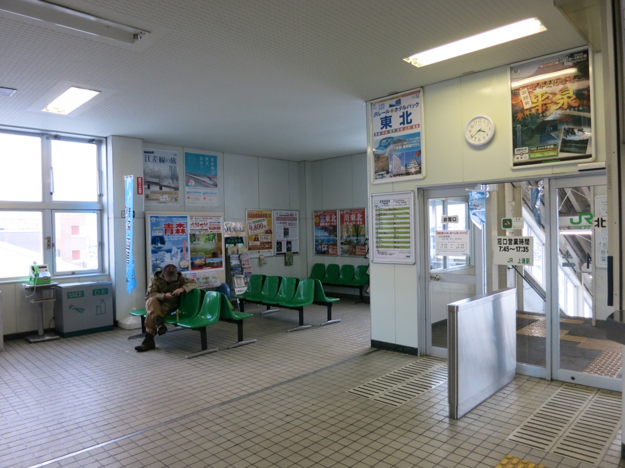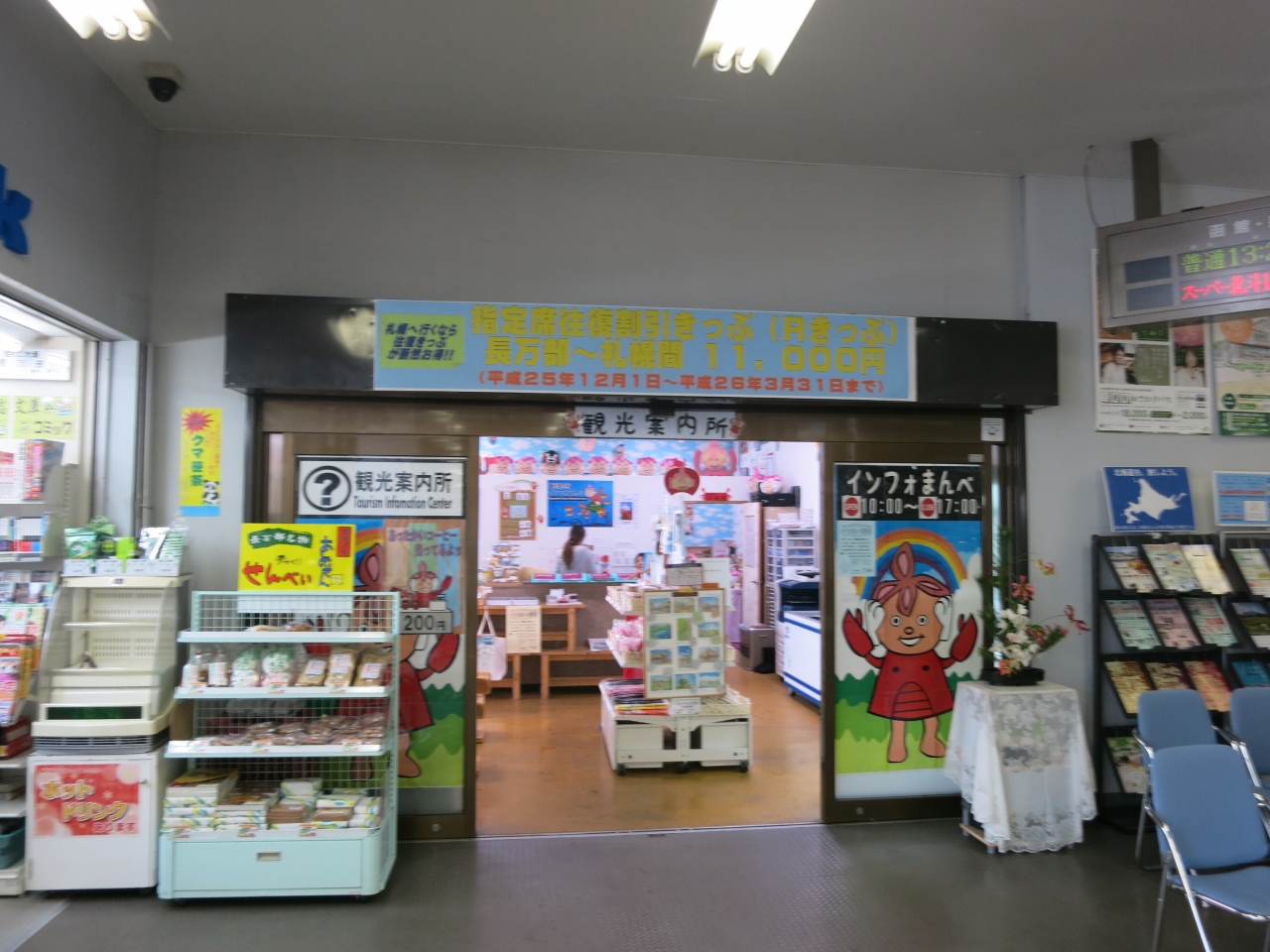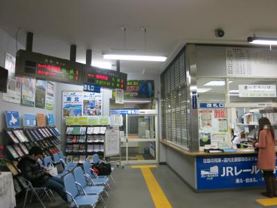 駅は橋上駅で、窓口も6時~20時まで営業し、待合スペースにベンチがあるほか、飲み物の自販機もあり、また、小さいながらもキヨスクも7:40~18:30まで営業しています。小さいだけあり、お土産はわずかしか販売されていませんでした。以前まで駅の入口付近に地元の物産などを売る店が入っていたのですが、2014年1月現在、エレベーター新設工事のため、閉鎖されていました。なお、駅前、歩いて1~2分のところにドラッグストアのツルハの大きな店舗があり、パンやお菓子、各種飲料まであって便利です。また郵便局も駅前にあり、ATMも利用できます(8:45~18:00)。ATMは、土日休日も時間は短くなりますが、開いています(土~17時、日・休~15時)。コンビニは駅の近くには見当たりませんでした。