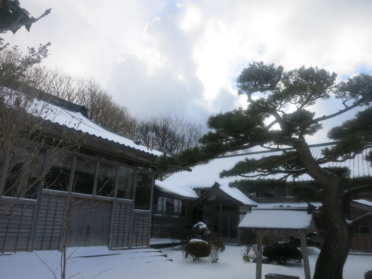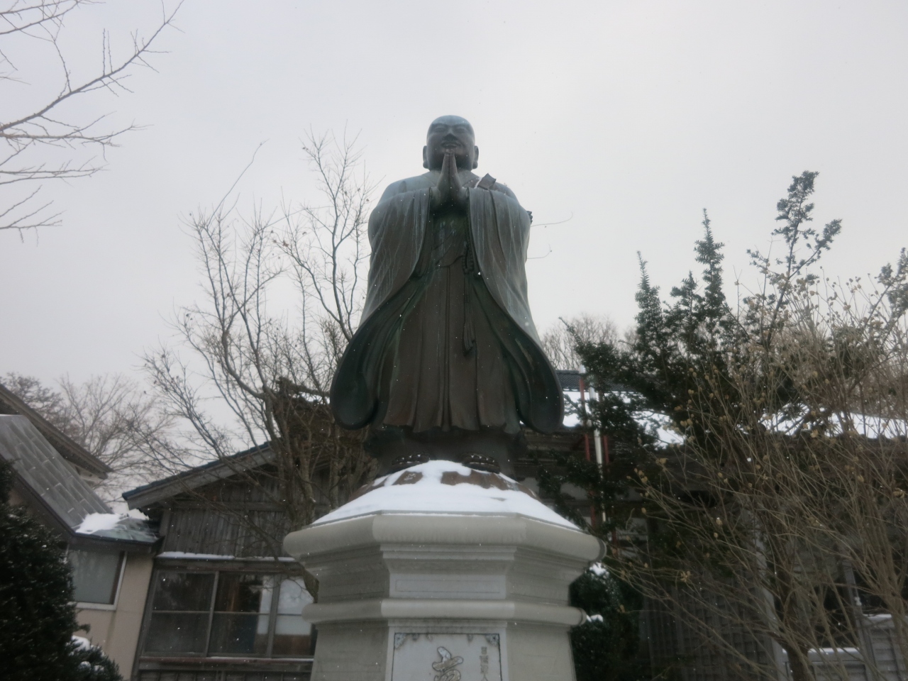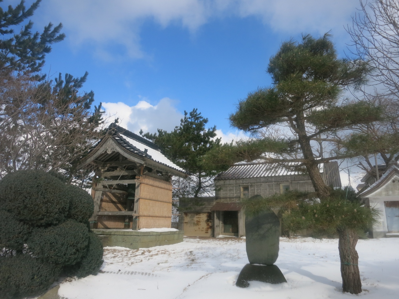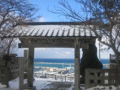 姥神大神宮の裏手の丘の上にあるお寺です。檜山奉行所だった立派な門と、その門から眺める江差の港の景色がとても良いです。訪れた時には今まで吹雪いていた悪天候が一瞬だけ和らぎ、わずかに覗いた青空と明るい陽射しが、海と港を照らしだしました。すると灰色だった海は息を吹き返すように青く光りだし、雪に白く覆われた江差の街並みに鮮やかに映えました。そんな一瞬をついて、奥尻島からのフェリーが港に滑り込んできました。港から聞こえる汽笛の音も旅情豊かに、寒く凍えていた旅人の心を潤してくれました。