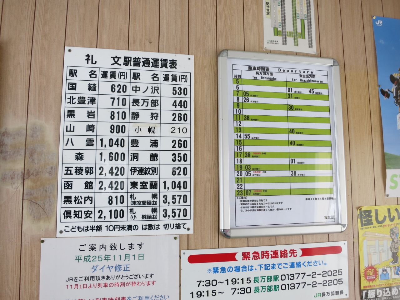 駅は無人駅で、長万部・函館方面の列車が停まる島式のホームに、東室蘭・苫小牧方面の片側ホームがあります。…ということで線路が3つ並んでいますが、真ん中の島式ホームについた線路は使われていないようです。待合室などもある駅の入口から、すぐ片側ホームになっていて、更に駅構内に踏み切りがあります。島式ホームに行くにはここを渡りますが、ホームから線路に下りるのに、少しスリル感があります。ましてや特急や貨物列車が高速で通過します。勿論、警報機がついていて、列車が近づくと放送も流れます。