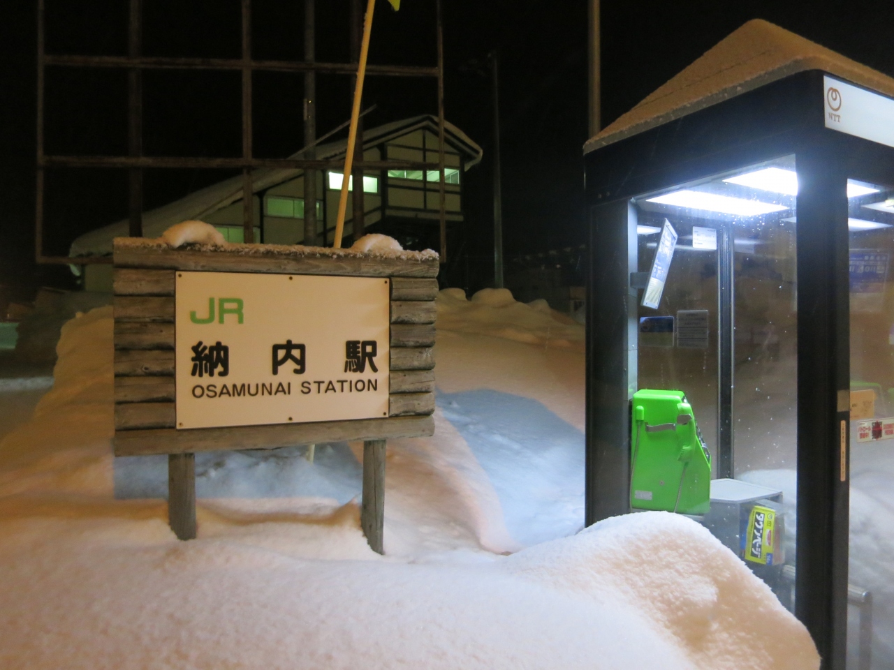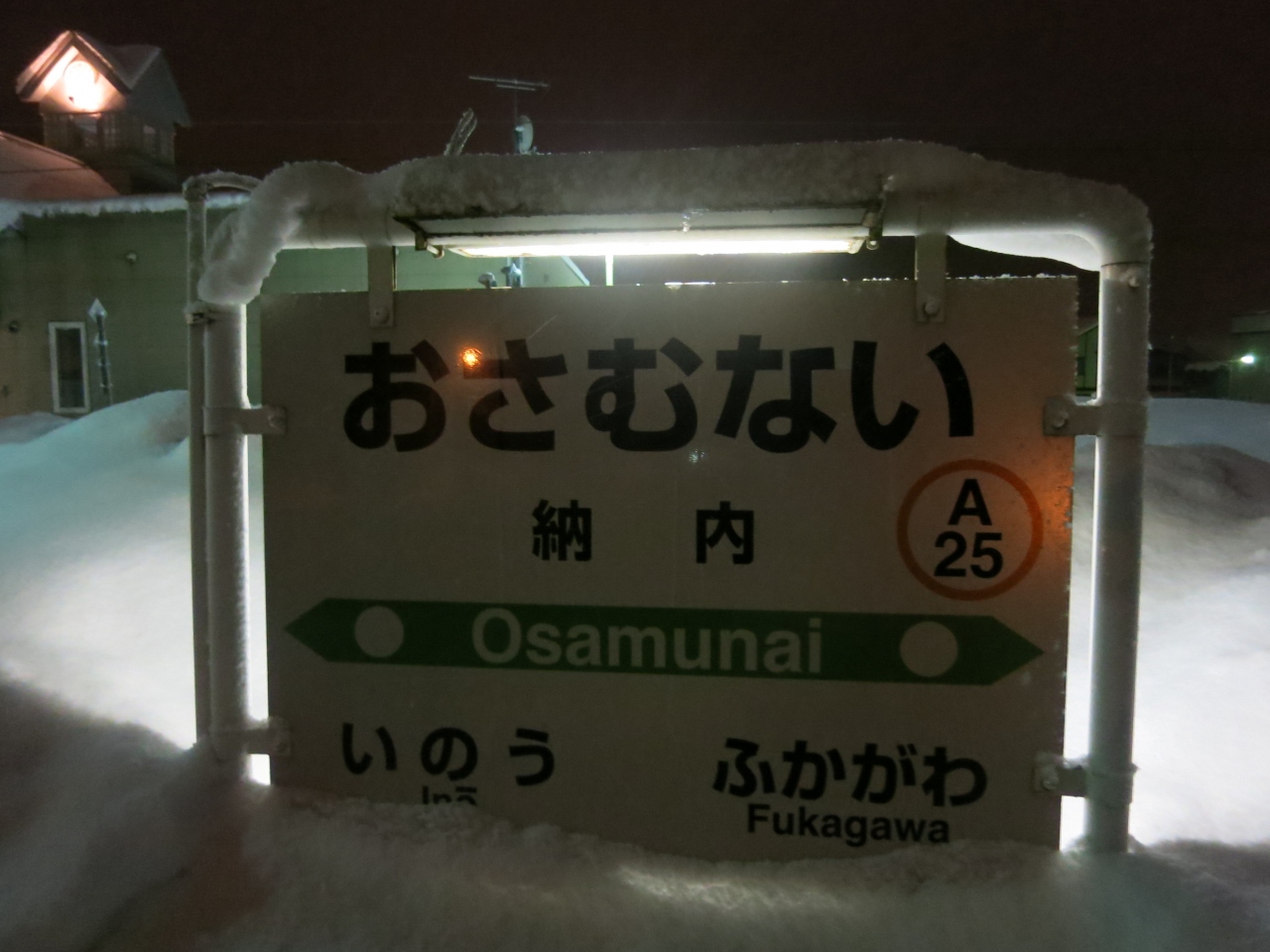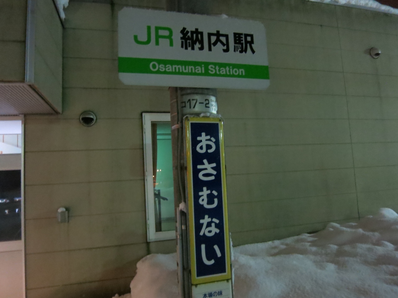 「オサムナイ」と読みます。旭川まであと3駅の函館本線の駅です。札幌〜旭川の幹線にありながら、普通列車しか停まらないため、1日9〜10往復の列車しか停まりません。ある方向へは、ひどい時(お昼あたり)には3時間待ちです(その間、特急列車は30分に1本くらいの割合で通過)。そんな時は1時間に1本の割合で出るバスを使います(土日休日は一部減便)。駅を出て200〜300mほど行った道道57号線に深川(深川市立病院前)〜旭川(旭川ターミナル)を結ぶ空知中央バスの納内バス停があります。旭川へは¥620円。列車の場合は¥440円です。