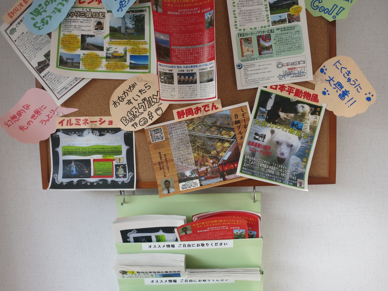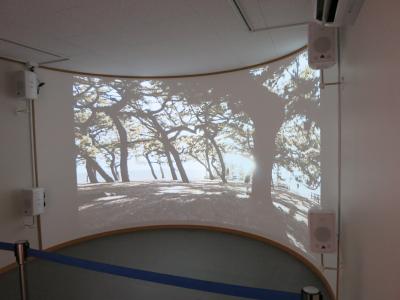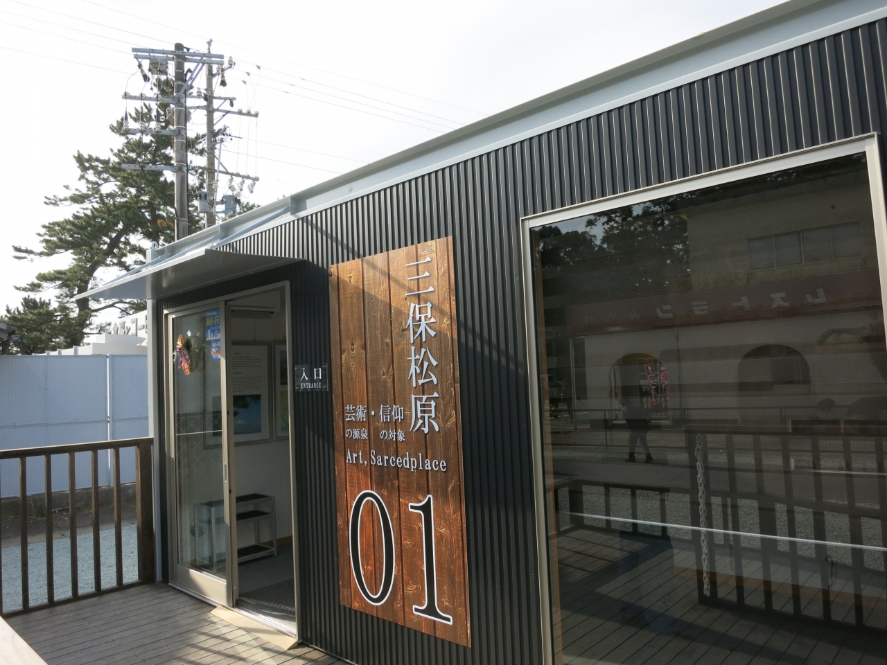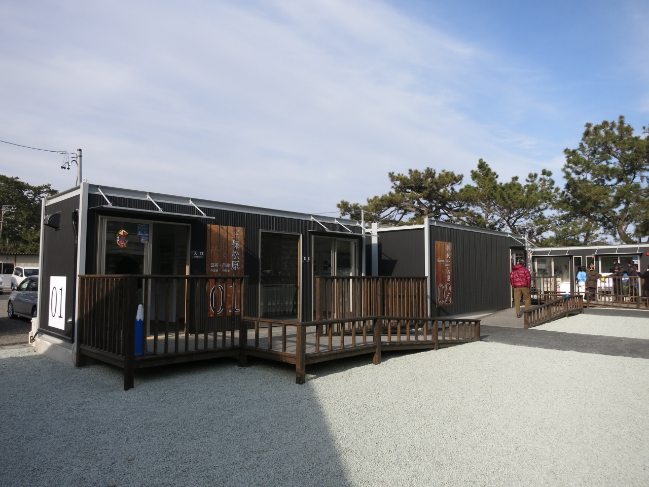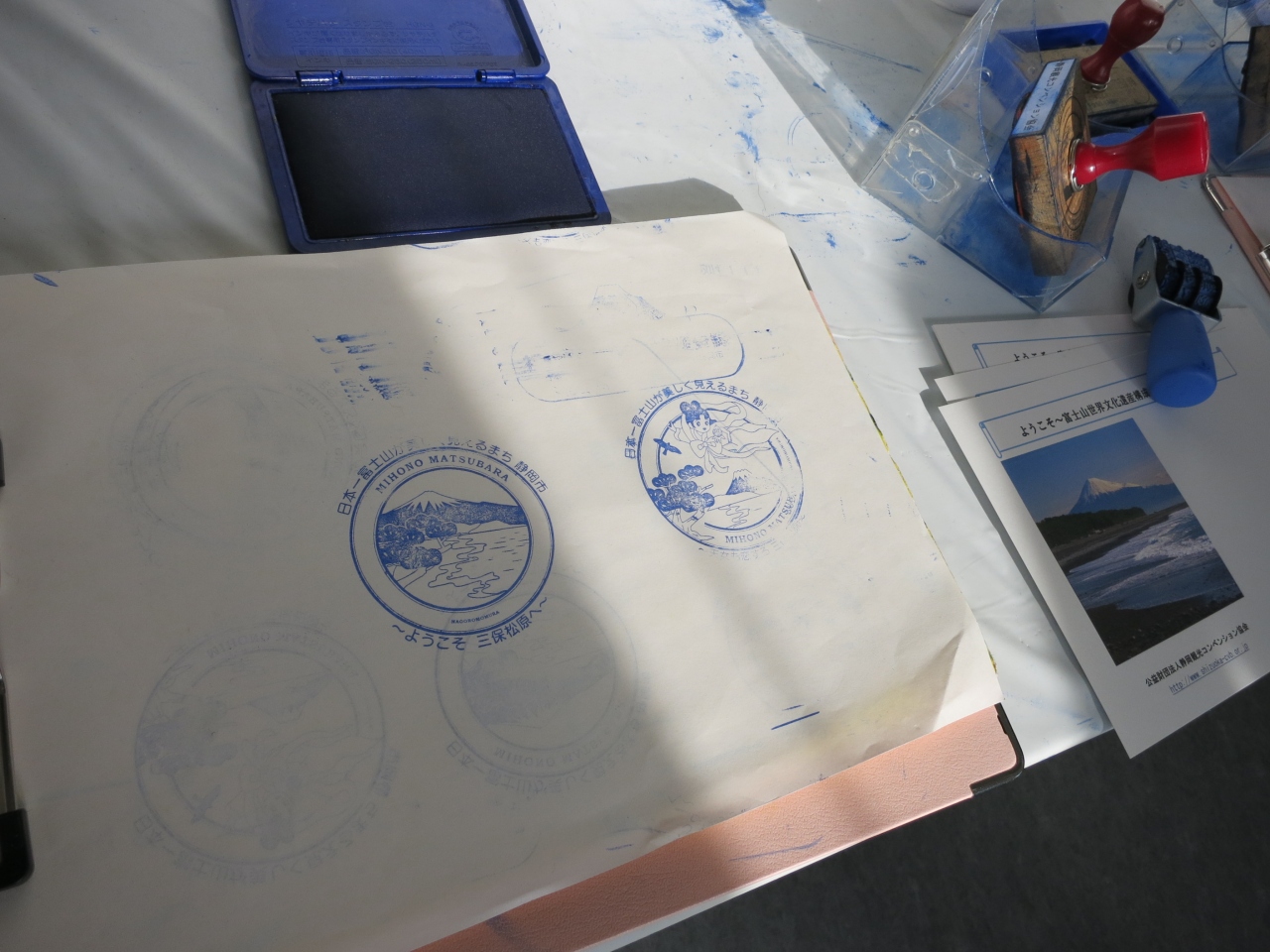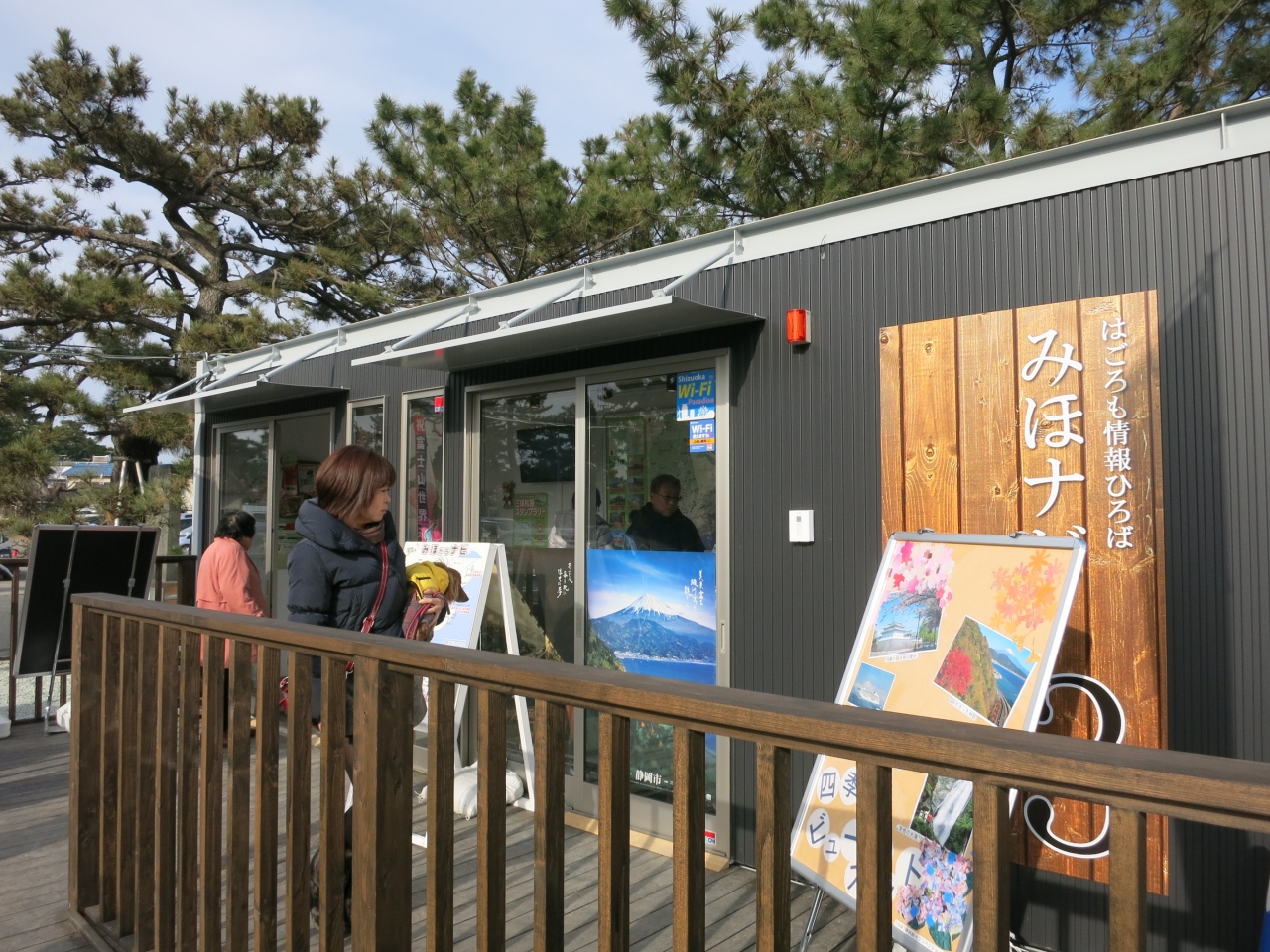三保の松原の駐車場横に2013年12月にできたばかりの観光案内所です。プレハブ風(工事現場のスーパーハウスみたい)で作りが少しお粗末ですが、3棟あり、1棟は松原を紹介するパネル展示。2棟目は松原を紹介する映像が流れています。天女になったような視点で御穂神社の神の道や松原を巡る数分の映像です。3棟目はスタッフの観光案内の窓口のほか、パンフレットが取り揃えられています。松原周辺部の地図や施設情報が載っていて便利です。記念スタンプもあり、富士山に松原の写真の入った台紙が無料でもらえます。