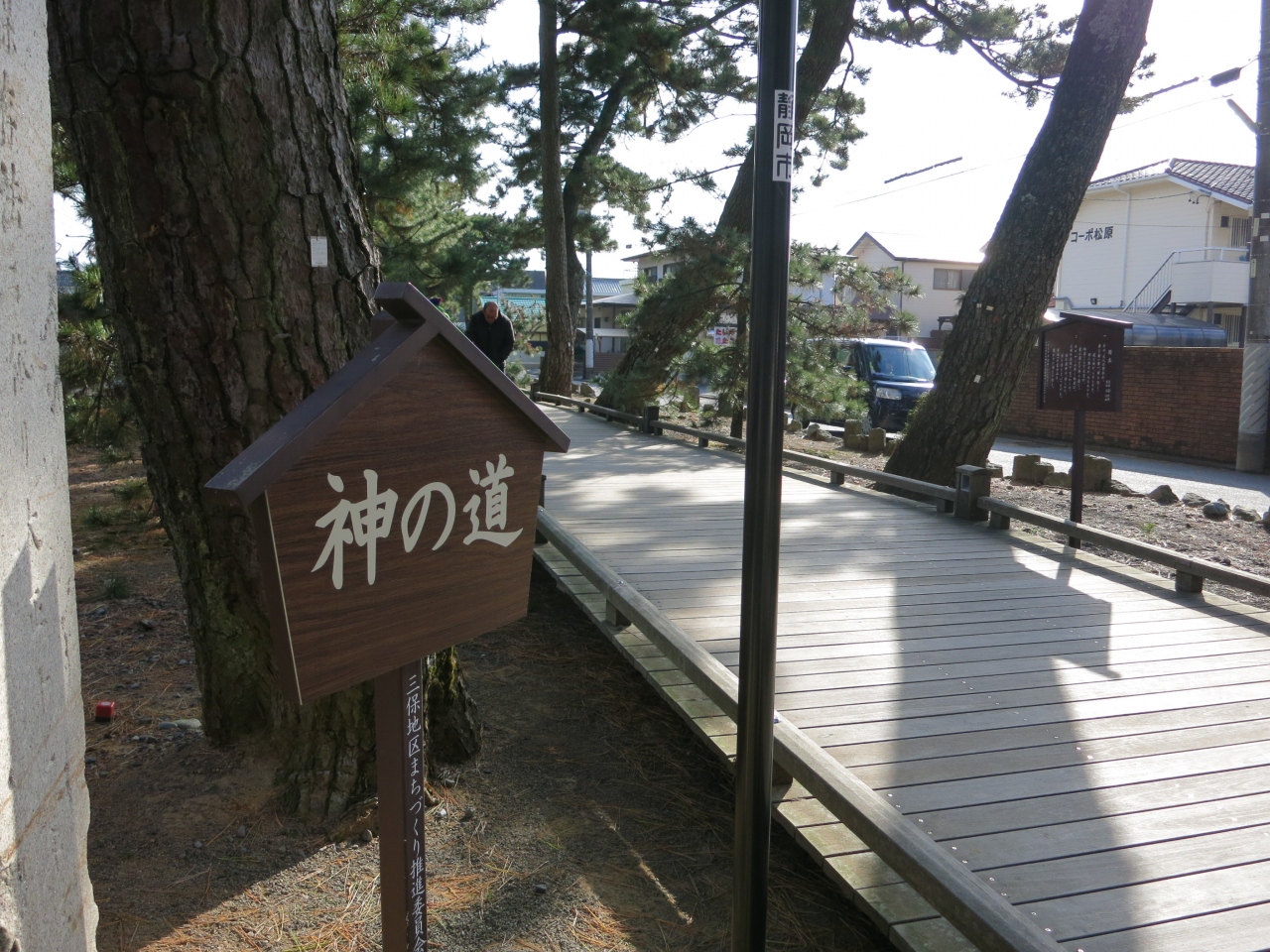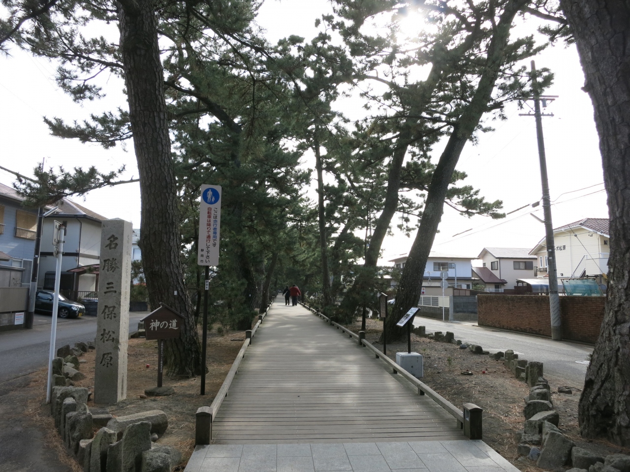 御穂神社から海岸の松原までの500mほどの参道です。周囲は住宅地ではありますが、見事な枝ぶりの松並木が続きます。近年、松の保護のために木道が整備されたようで、とても歩きやすくなっています。御穂神社または羽衣の松までの雰囲気を盛り上げてくれます。