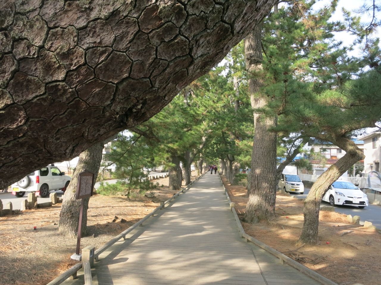 ただ、正月の休み期間に行きましたが、たくさんの観光客と車の渋滞でした。神の道の両側は、それぞれ一方通行の道路になっていて、マイカーや大型観光バスが数珠つなぎになっていました。そのため、騒音と排気ガスで雰囲気はいまいち。松の生育にも悪影響と、環境問題にもなっているようです。ここの松もやがて立ち枯れてしまうのでしょうか。- 旅行時期