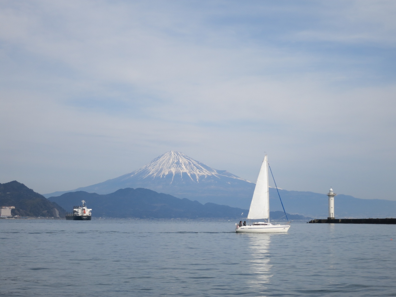 富士山を背に、白い帆を翻したヨットが通ると、まるで昔の帆掛け船を彷彿とさせる雰囲気に包まれます。