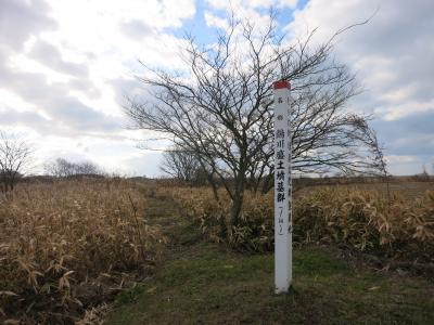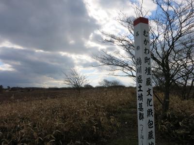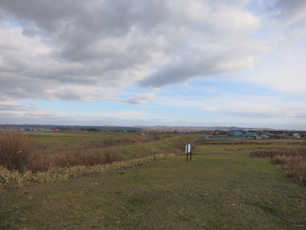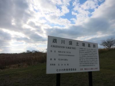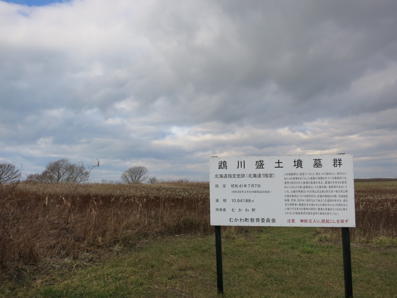 場所は鵡川の市街地から国道235線を静内、浦川方面に行き、鵡川橋を渡り、500mほど行ったコンビニのセブンイレブンのところで、右(海の方)の小道に入っていきます。鵡川大漁地蔵尊(イモッペ地蔵)の案内板も立っています。1.5kmほど進んだところにありますが、道路沿いには案内板などもなく、よく見ていないと過ぎ去ってしまいます。付近に近づくと草原があり、奥の方に看板が立っているので近づいてようやくそれだと分かります。ただ、雑草の生えた一面の草原で、墳墓は土中に埋まったまま保存されているようです。一帯は付近の畑作地より4~5m高く、脇を珍川という鵡川の支流が流れていました。訪れたのは11月下旬。遠くには晩秋のすすけた茶色をした日高の山並みが見えました。あたり一面、雪に覆われるのもまもなくです。しぐれ雲の間から、すっかり温かさが失われているものの、まぶしい日差しが時々、あたり周辺を照らしていました。