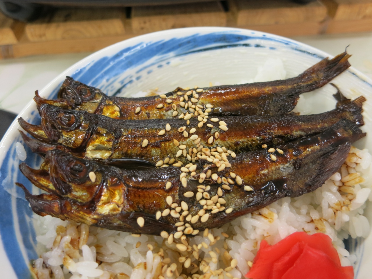 ししゃもの加工工場を併設し、各種ししゃも料理を出してくれます。10月~11月にはこの時期しか食べられないししゃも寿司が出されます。この時期にししゃも漁が解禁されるからです。さっぱりとしてほどよく脂ののった生のししゃもにわさびが付いて、しょうゆや山椒塩をつけていただきます。使われているしゃりは地元鵡川でとれた、おぼろづきという品種だそうです。店内の各テーブルにはホットプレートが載っていて、塩焼きもできるようです。