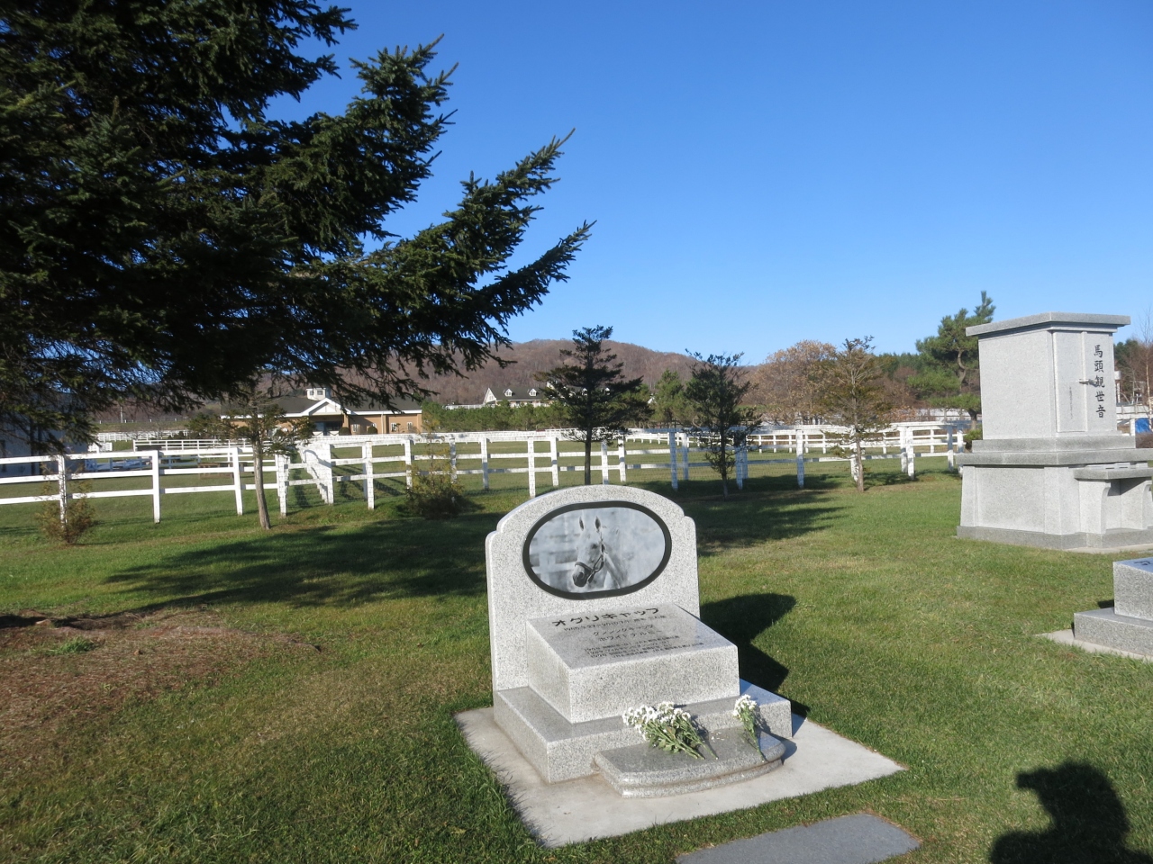 馬には詳しくないのですが、細身でいかにも速そうな良いスタイルをしていました。晩秋の日の光を受け、その美しい馬体は銀色にきらめいていました。そして隣にはそのお墓が。白い花が手向けられています。他の数々の名馬たちとともに静かに眠っていました。