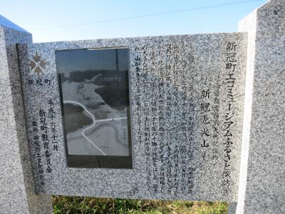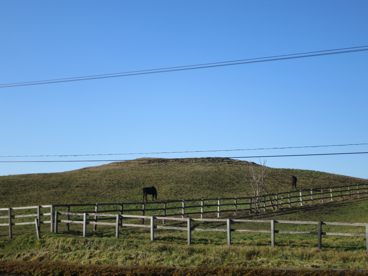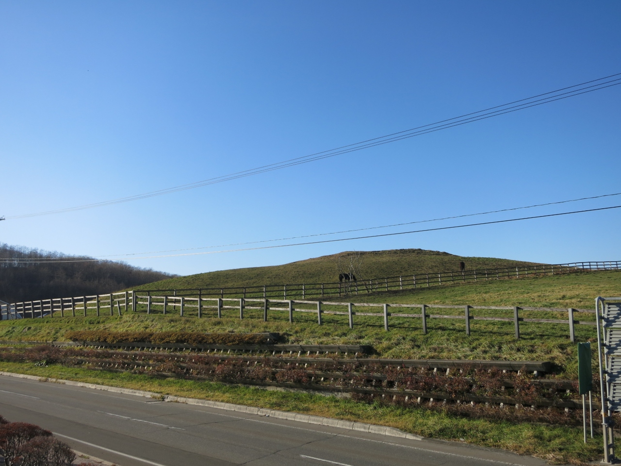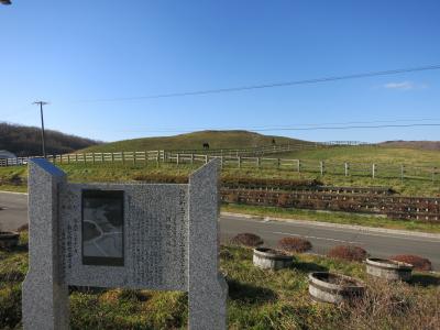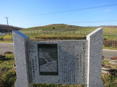 牧場の中にあって近くでは見ることができません。とても緩やかな草原の丘なのですが、土砂や水、ガスが噴出する火山なのだそうです。これだけ大きいものはとても珍しく、北海道の特別天然記念物に指定されているとのことです。小さいものなら、阿寒湖のボッケもそうなのかもしれません。こちらは近くで見ることができます。なお、牧場の馬が泥火山の近くまで寄って静かに草を食んでいました。残念ながら人間は、道路を挟んだサラブレット銀座の展望台から眺めることになります。眼下に広がる新冠八景に数えられる馬牧場の風景とは反対側に、泥火山の説明の石板が立っていました。