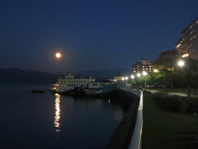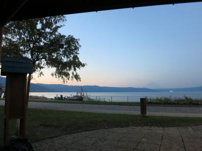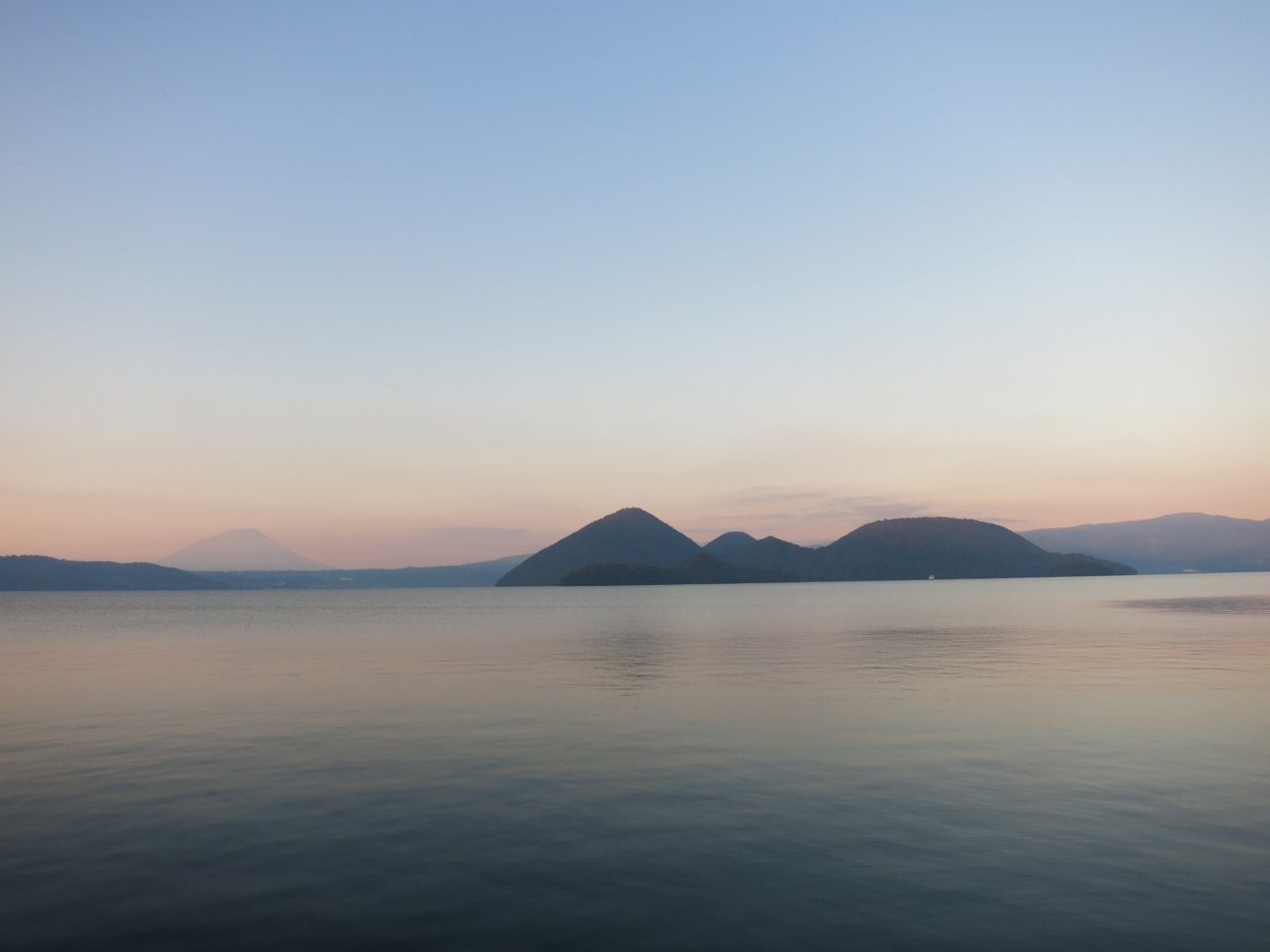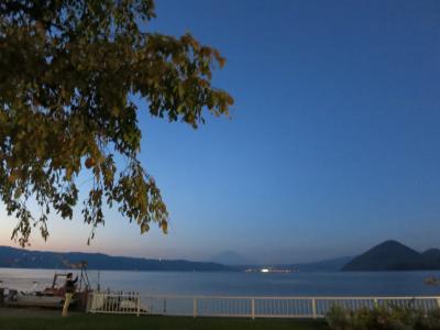夕闇に暮れていく湖や中島、羊蹄山が、茜色、紫、群青、藍色、紺へと移り行く様子を眺めていると時がうつろうのも忘れてしまいそう。