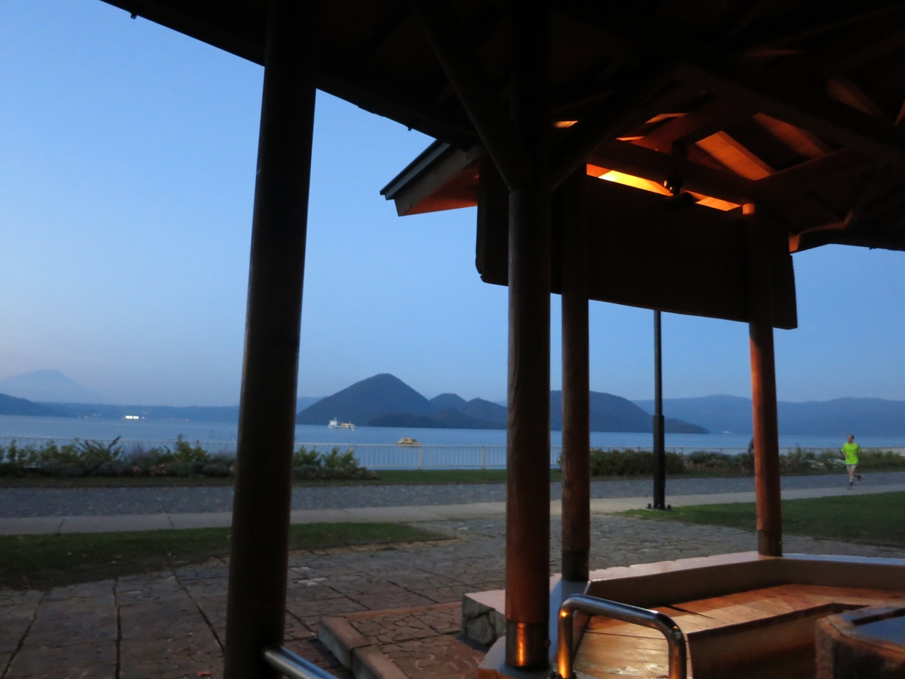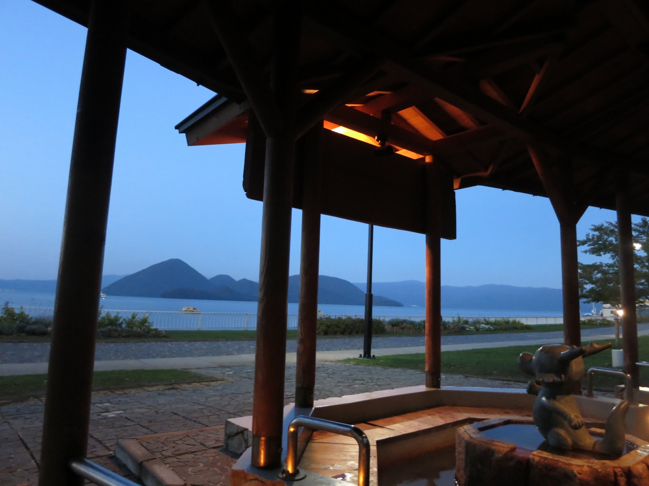 洞爺湖畔より湖を眺めながらぽかぽかつかる足湯。