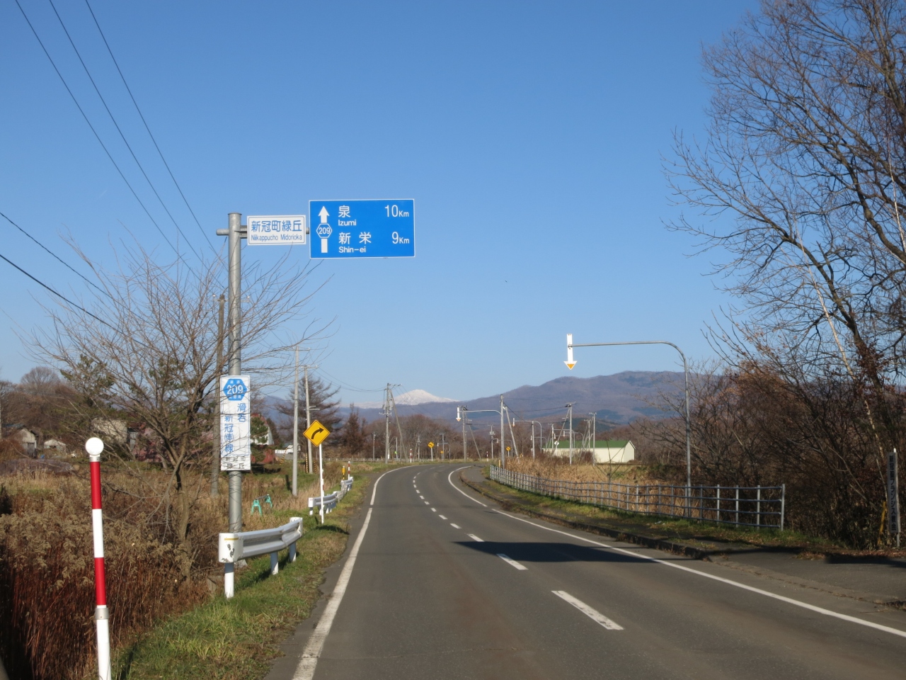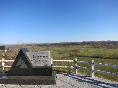国道から分岐まもなくの1丁目の高台には駐車場公園があり、新冠川河畔から銀座の道路両側に広がる牧場の風景が、雪をかぶった日高の山並みを背景に美しく広がっていました。逆側には晩秋の日の光きらめく海も遠くに見えて良かったです。反対方向を向くと、北海道の特別天然記念物に指定されている新冠泥火山があります。近づくことができないので、普通の牧草地の丘に見えました。