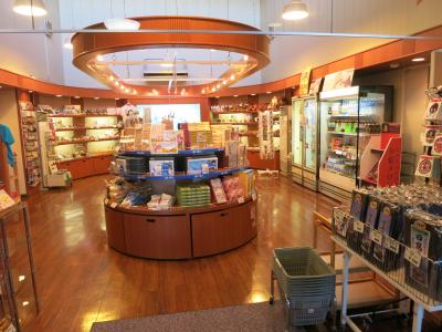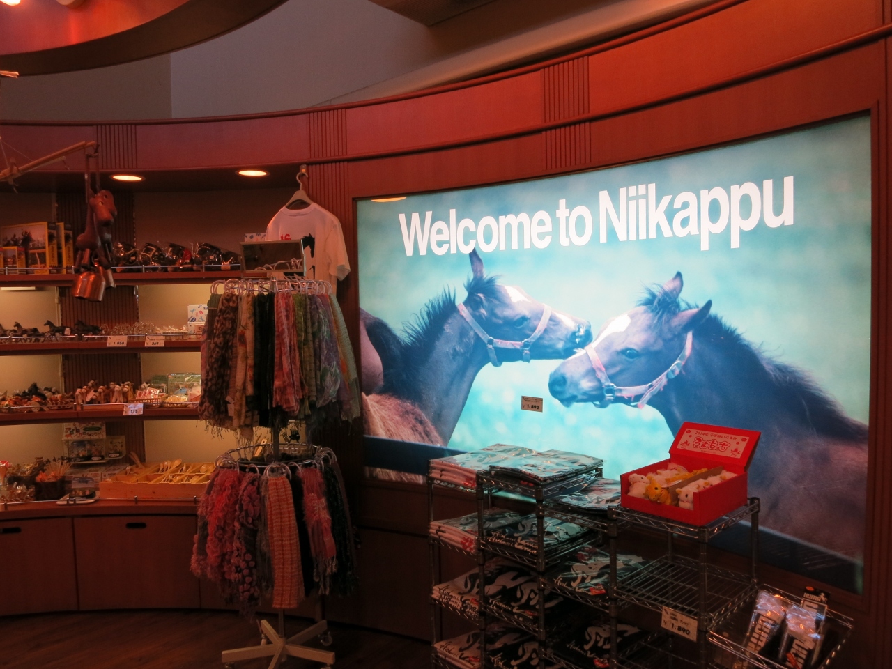 道の駅の中にはトイレは勿論、椅子やテーブル、それにテレビのある休憩スペース、そしてお土産の店やレストラン、花屋などが入っています。お土産屋(物産館)には、にいかっぷショコラ、ばふんまんじゅうなど、地元、新冠のお菓子のお土産のほか、馬のぬいぐるみなど、馬の産地、日高らしいお土産が取り揃えられていました。