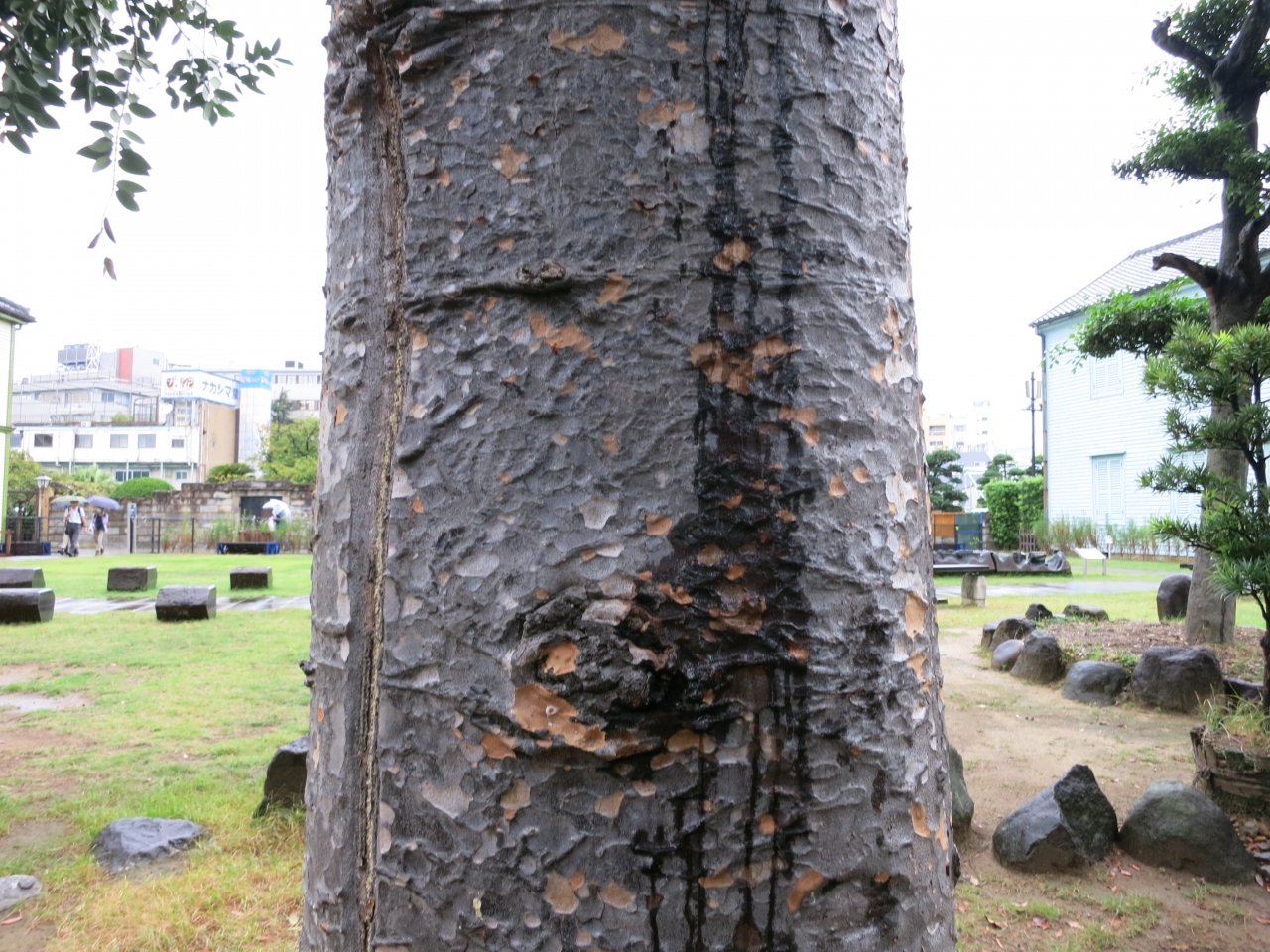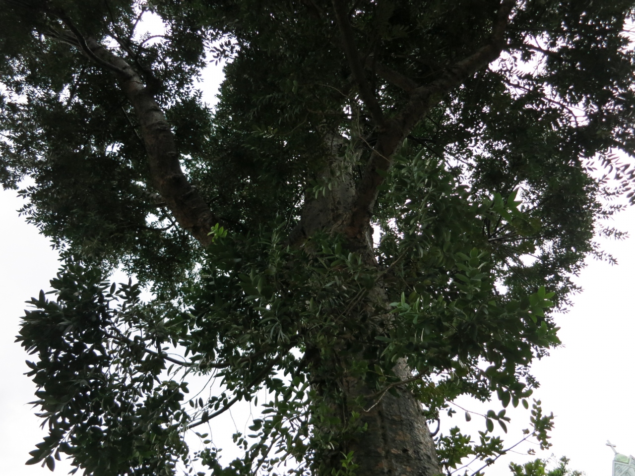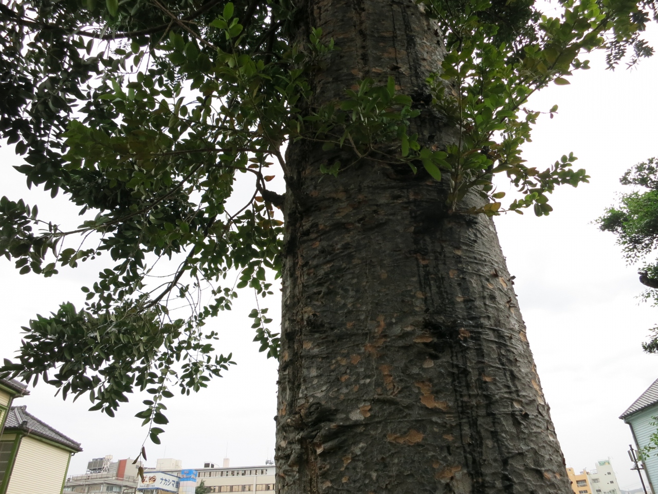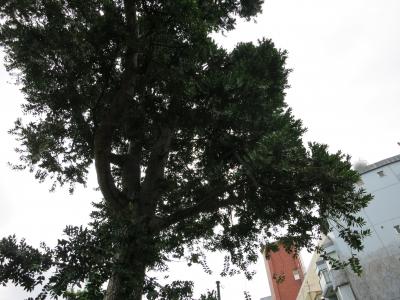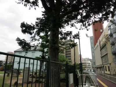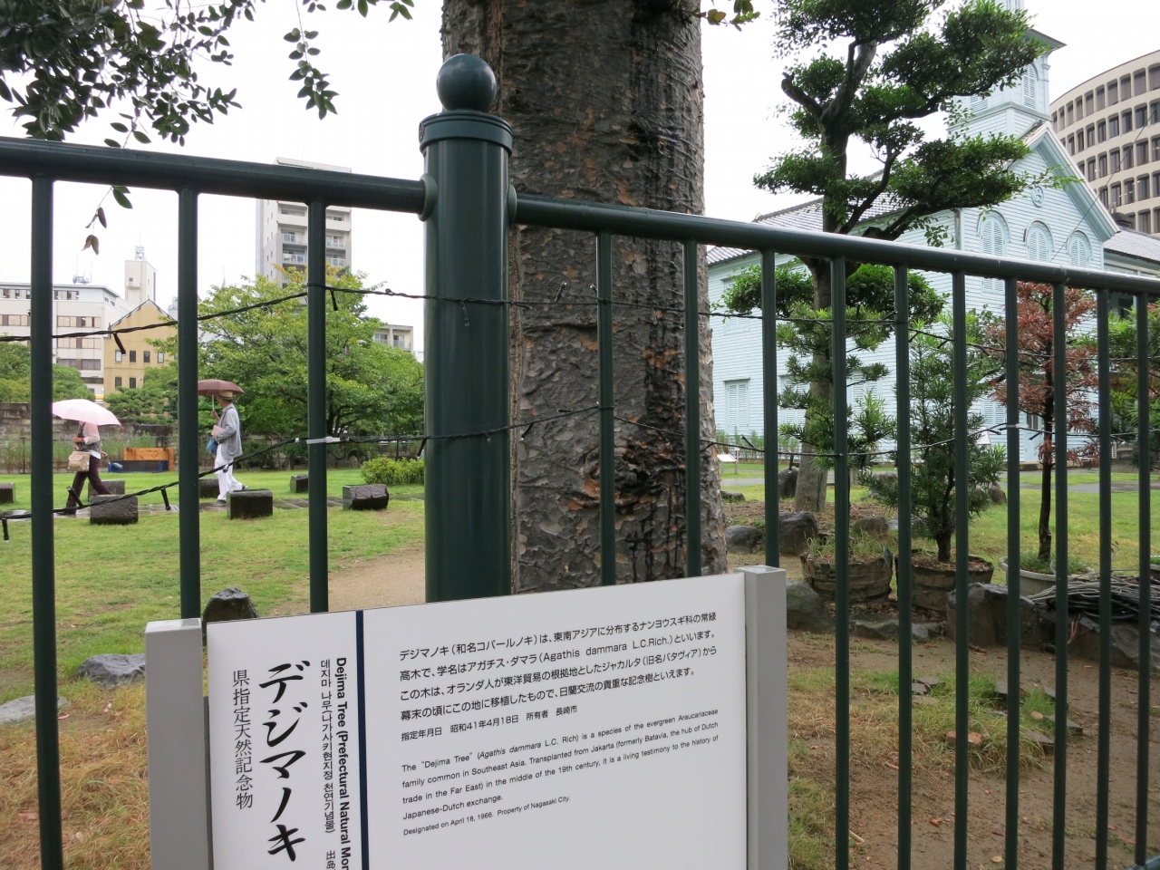 出島の跡の先端部あたりに、目の上のたんこぶのようにニョキっと生えています。護岸に張り出していて、その復元工事も妨げている感じです。出島の敷地内から見ると、他にも木が植わっていることもあり、ただの庭園木のようですが、外に面する道路から見るとそう思います。