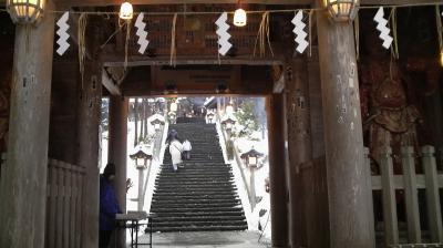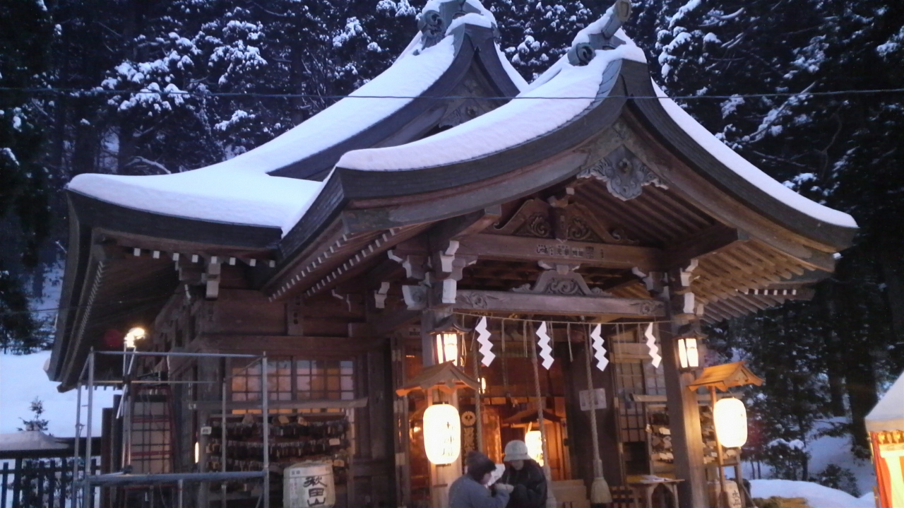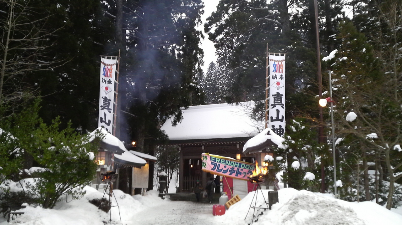 ただ、付近は意外と山深く、冬は雪が積もっています。神社の裏から真山(567m)、本山(715m)を経由して海沿いの門前まで行くお山かけも冬は大変だと思います。なお、門前には男鹿駅までのバスが出ています。