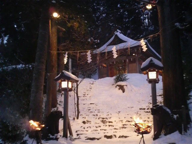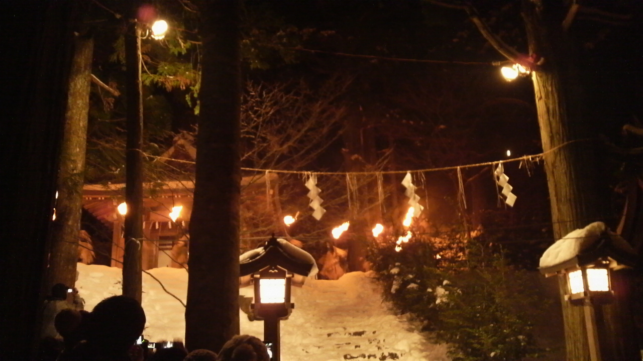毎年2月の第二金・土・日曜日に行われる、なまはげの柴灯(セド)まつりの会場になります。祭りの時に行きました。当日は神社まで数百mのところの駐車場まで、男鹿駅と男鹿温泉郷から臨時バスが出ていました。普段は車のほか、秋田駅からの観光バスが出ていたり、男鹿駅や羽立駅からタクシーを使ったりすることが多いようです。路線バスの場合は、最寄のバス停が遠く、祭りは神社の近くまで楽に行けるチャンスです。