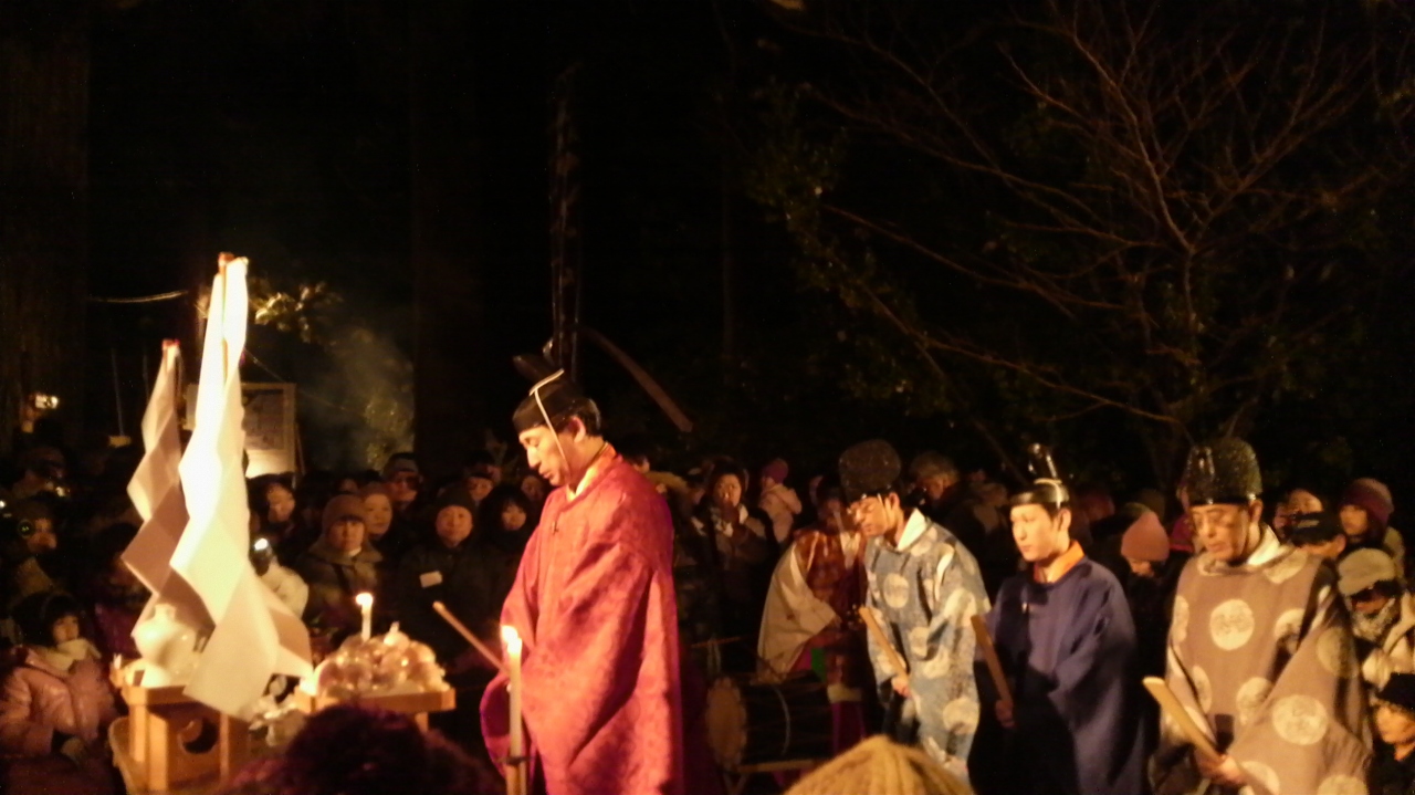 これに柴灯まつりの神事を加え、会場の広場は人でごった返します。場所が神楽殿、拝殿近く、柴灯火の近くなどに移動するため、良い場所のキープが大変です。あらかじめ演目を選んで場所をとることも必要かも。