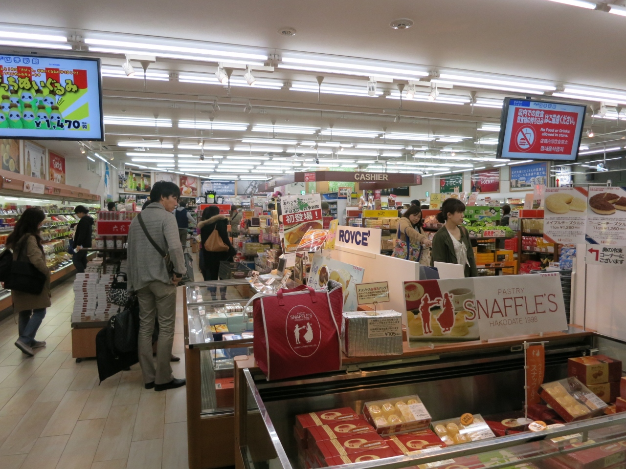 札幌駅西口の改札横にあるキオスクです。店の右側はお弁当や飲み物など、一般的なキオスクの商品を売っています。左側は北海道のお土産です。スイーツ・お菓子類から乳製品、水産加工品、そしてアクセサリー類まで、帰路に向けて出発前に便利にお土産が揃います。結構、品数はあると思います。行ったときには、はろうきてぃの月寒あんぱんというのがありました。通常は月餅にも似た味なのですが、りんごあんということでした。