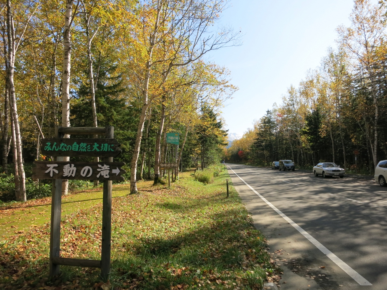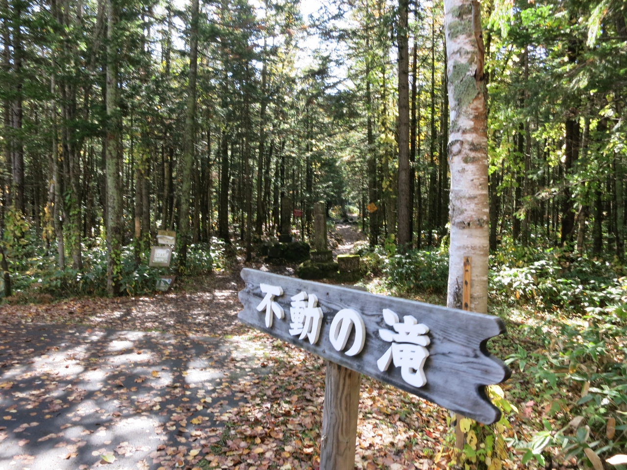 青い池から1kmほど、白金温泉の方に白樺街道、道道966号線を進むと道路脇に不動の滝の案内標識が見えてきます。滝はそこから森の中を進むこと200~300mほど。林道のような泥の道で、雨の日の後などはぬかるんでいます。霊場ということで、不動明王や石仏が散見されました。行ったのが清新な朝日が森の中にも木漏れ日として差し込むような日だったので、あまりおどろおどろしい雰囲気ではなかったです。
