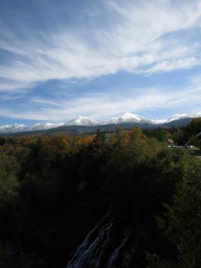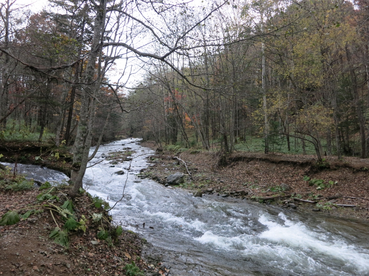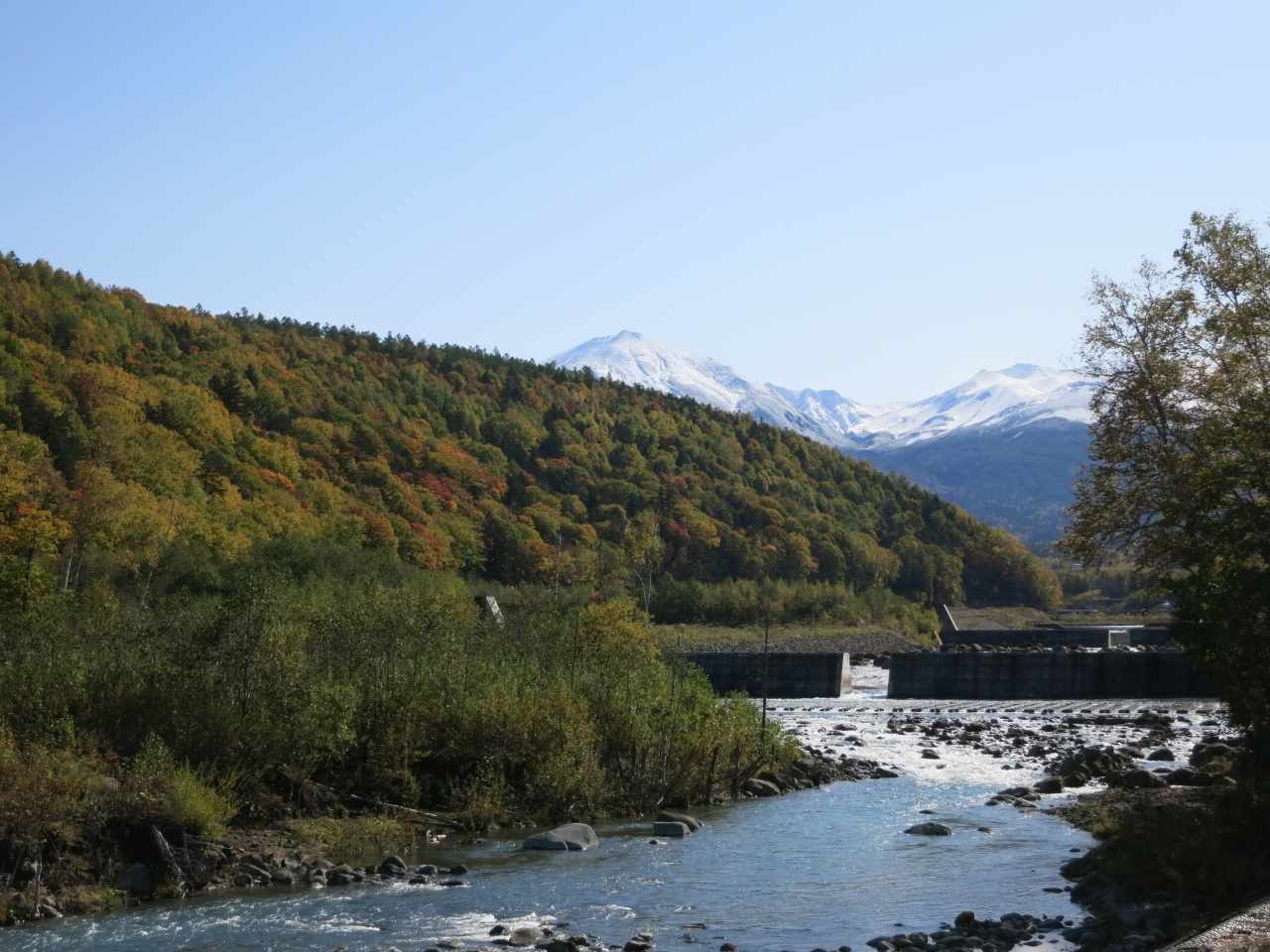 清新な朝の光が降り注ぐ中、黄葉の木々の散策道を、池を眺めながら進むと、やがて美瑛川のほとりにでました。遠くに白雪をいただく十勝岳連峰がわずかに見え、川のせせらぎの音が爽快感を誘います。