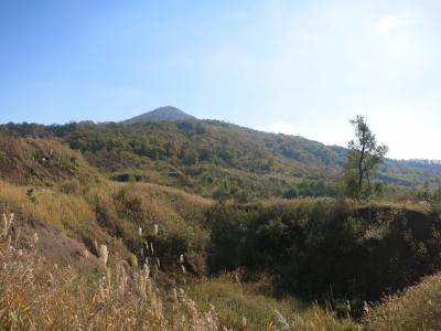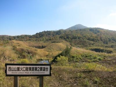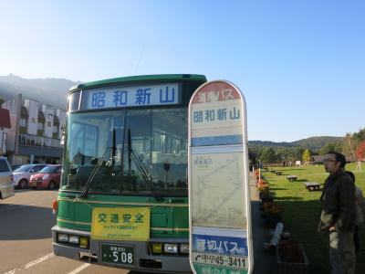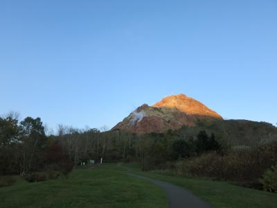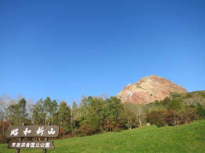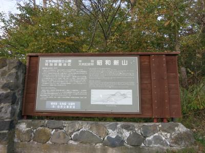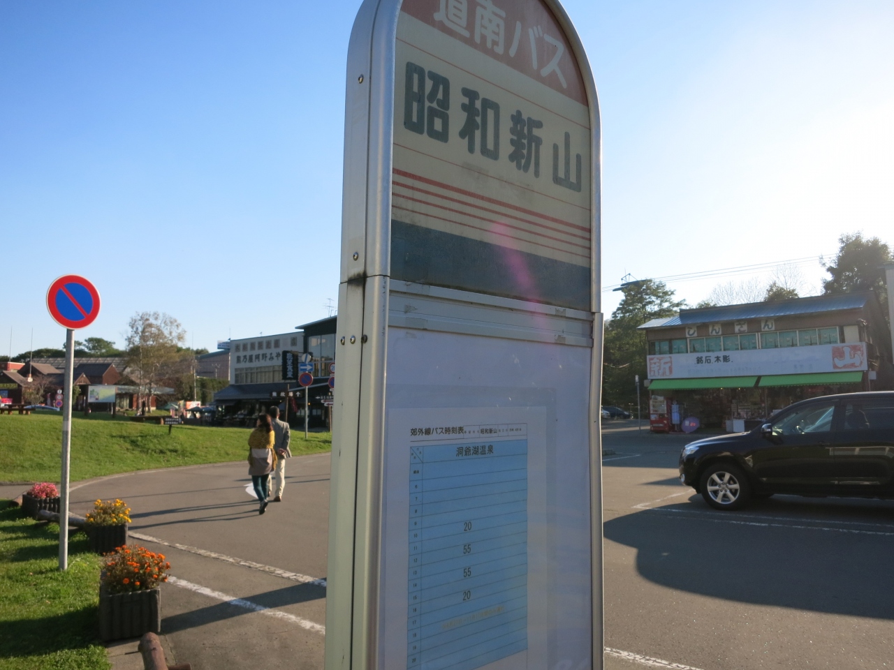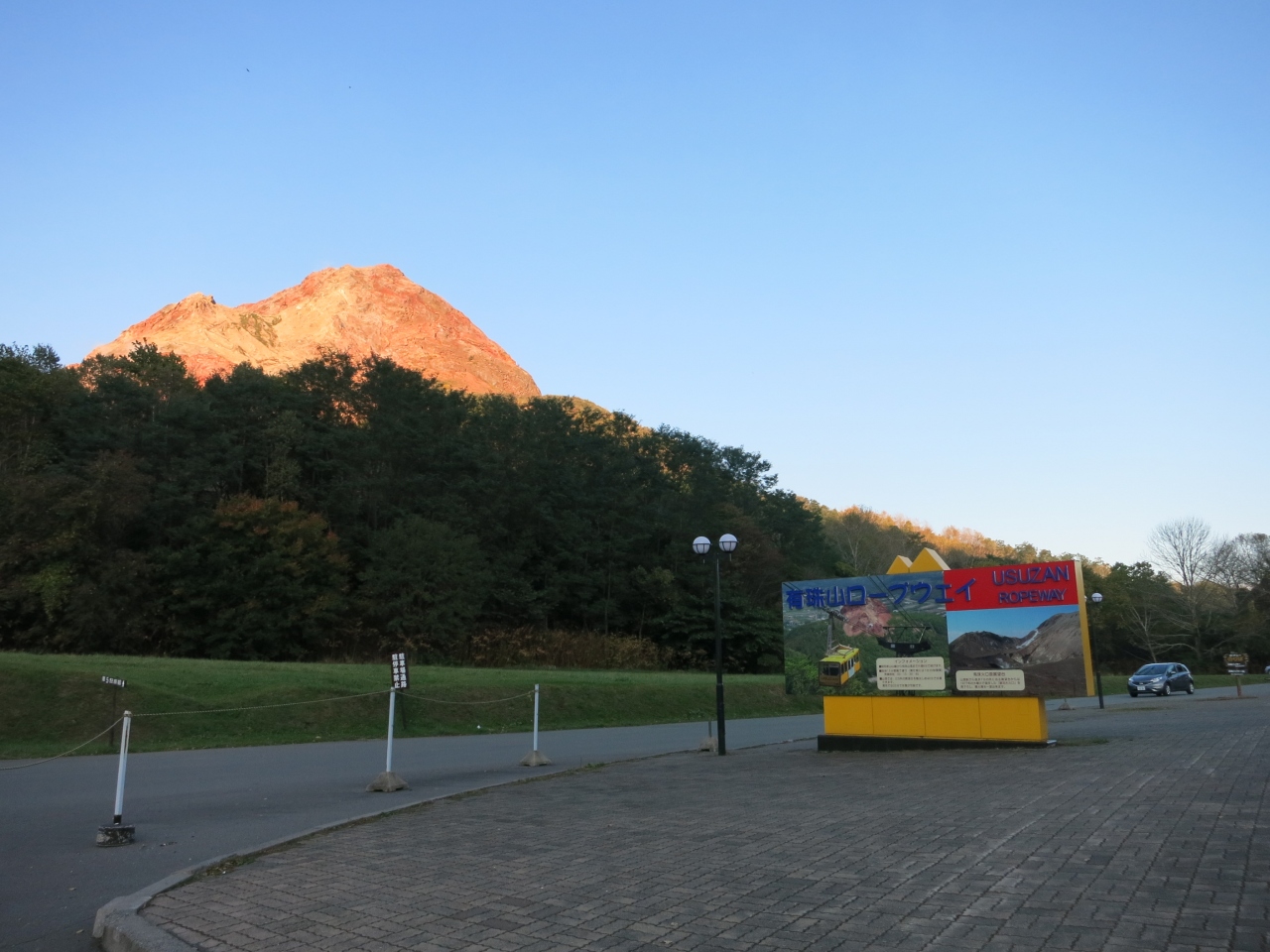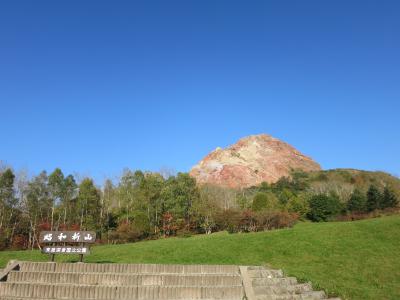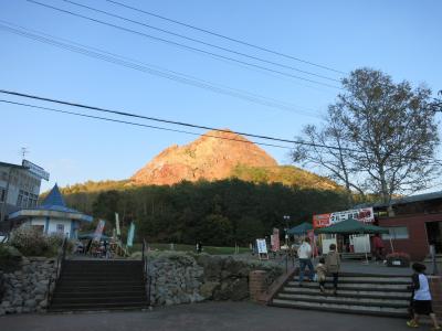赤茶けた山肌から白い小さな噴煙をあげ、午後の傾いた日差しを受けて明るく光っていました。山の直下、麓から眺められます。また、有珠山ロープウェイの駅があるので、ロープウェイや有珠山から見下ろしてもよいかと思います。麓のロープウェイ駅付近は、くま牧場、飲食店やガラス細工の店があるなど観光地化しています。秋の休日に行きましたが観光客で混んでいました。海外からのお客さんもいます。駐車場は通常期は有料のようです。観光バスなどもいっぱい乗りつけていました。なお,路線バスで行くと結構、不便です。洞爺湖温泉から昭和新山まで15分あまり。短い路線ですがバスがあります。しかし、1日に4往復しかありません。洞爺湖温泉発、朝10時が始発で、2時間間隔です。だからと言って歩くと7~8km。かなり距離があります。自転車だと多少傾斜のある坂を登ることになります。