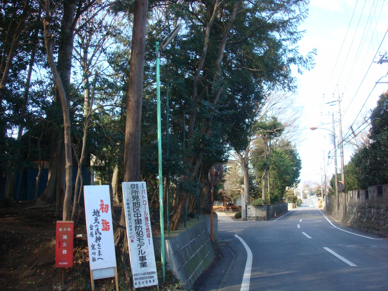 神社付近は森になっていて、雰囲気のある環境です。神社の前もよく見ると細い路地の交差点になっていて、森の中に入っていくものもあります(行き止まりだと思いますが)。昔はきっと周辺はこのような森の中の薄暗い泥の小道だったのかも知れません。近辺では県道22号線横浜伊勢原道路のバイパスが作られつつあるほか、森が切り開かれ開発が進んできています。旧道の狭隘や混雑が解消されるのは爽快です。しかし、付近は郊外の鄙びた相模丘陵の雰囲気のある森が多かったはずなのに、このような環境のままだと治安が悪くなることも残念です。- 旅行時期