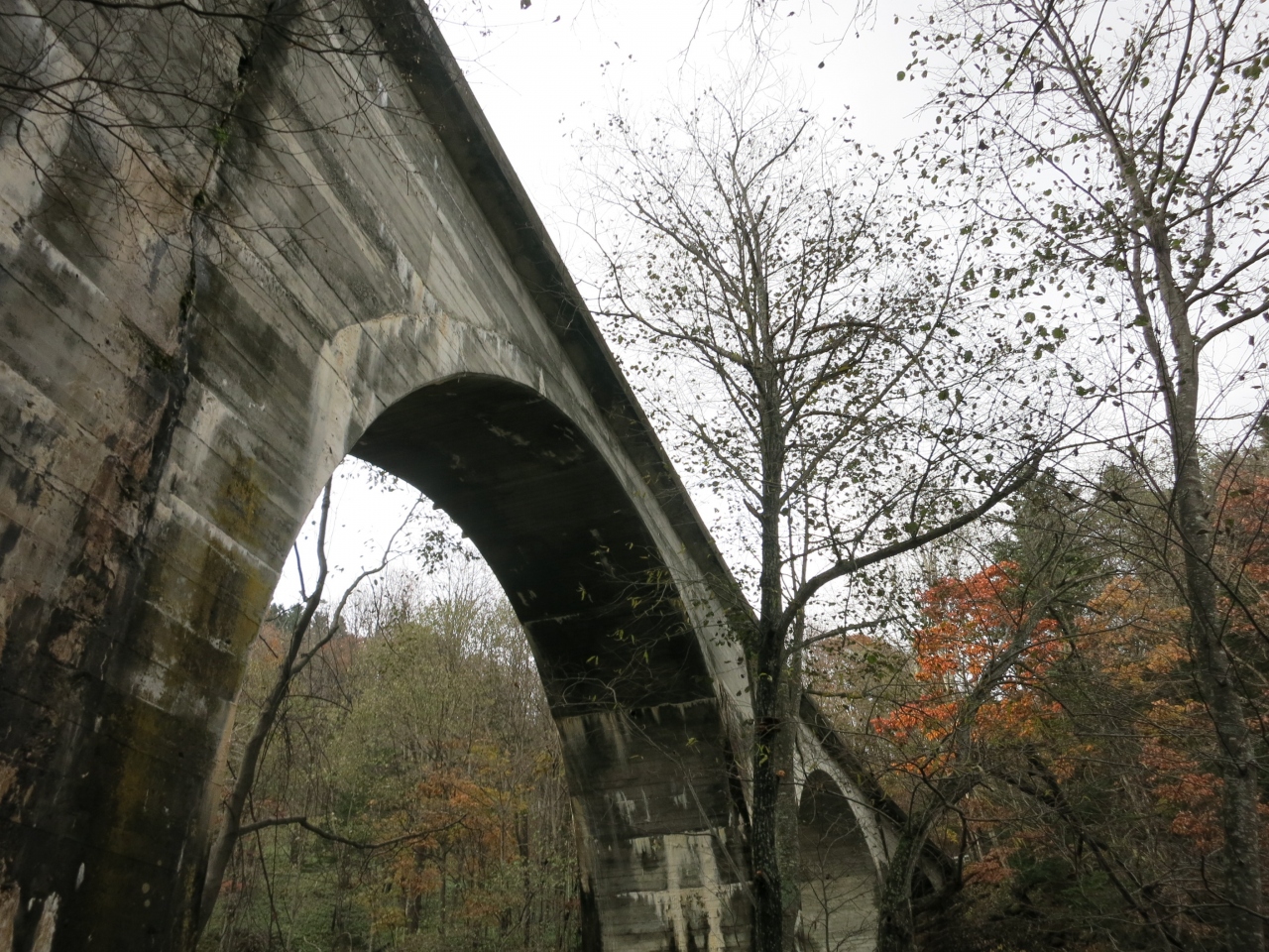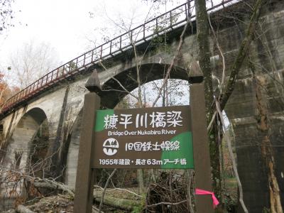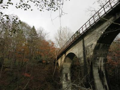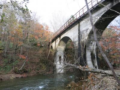 源泉郷では温泉めぐり以外にも、ひがし大雪自然館、鉄道資料館、夏期は早朝気球乗船など観光ポイントがありますが、森の中にも散策路があり、糠平川橋梁は、散策路を行ったひがし大雪自然館の裏手、キャンプ場の奥にあります。沢に下りて行った糠平湖畔(湖が満水のときは橋の足元まで湖水)です。タウシュベツ川橋梁と違って何連ものアーチとはいかず、更に橋の足元を木々に囲まれていますが、崩壊はそれほどでもなく、橋の上を歩いて渡ることもできます。