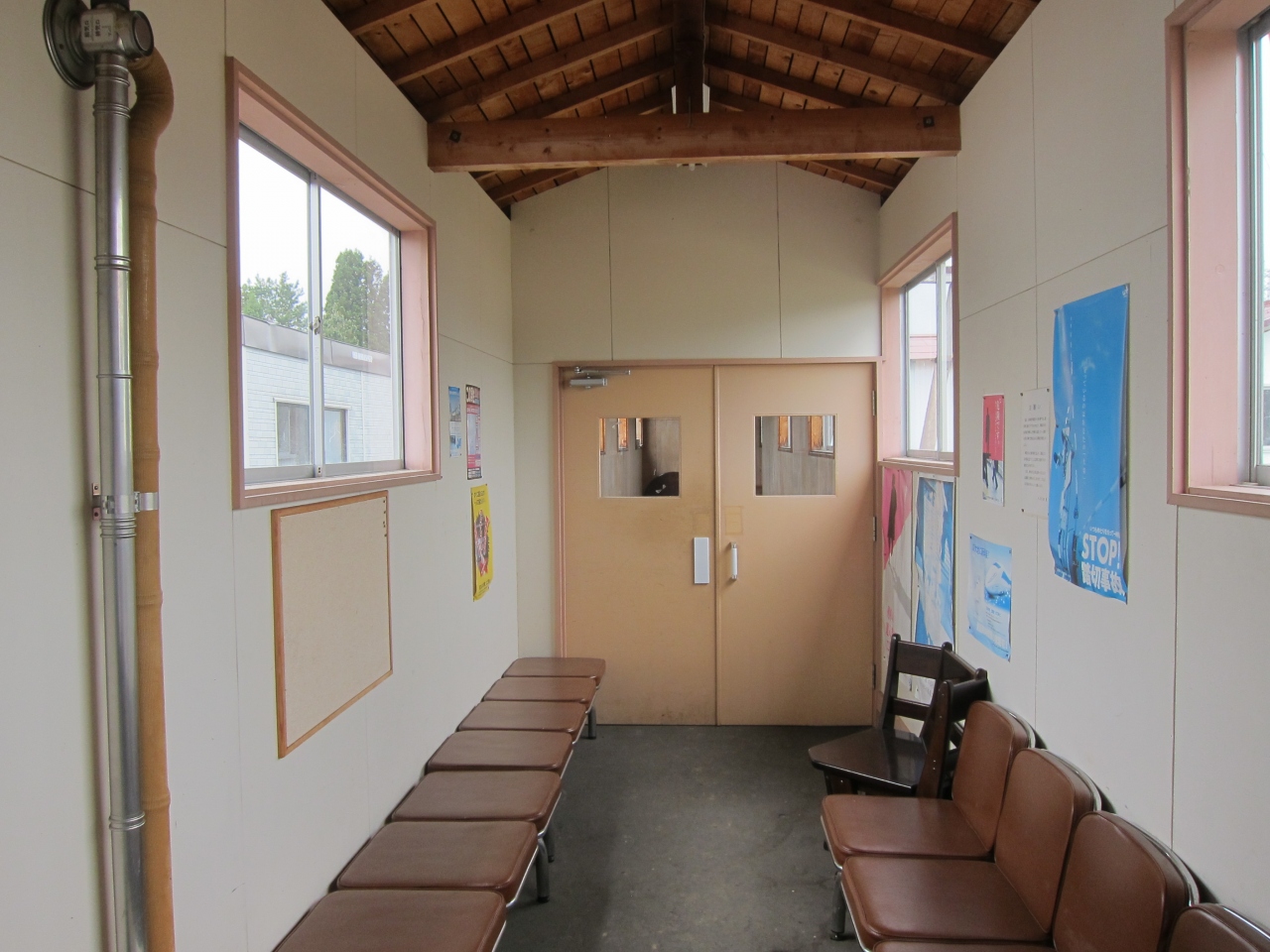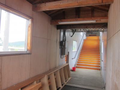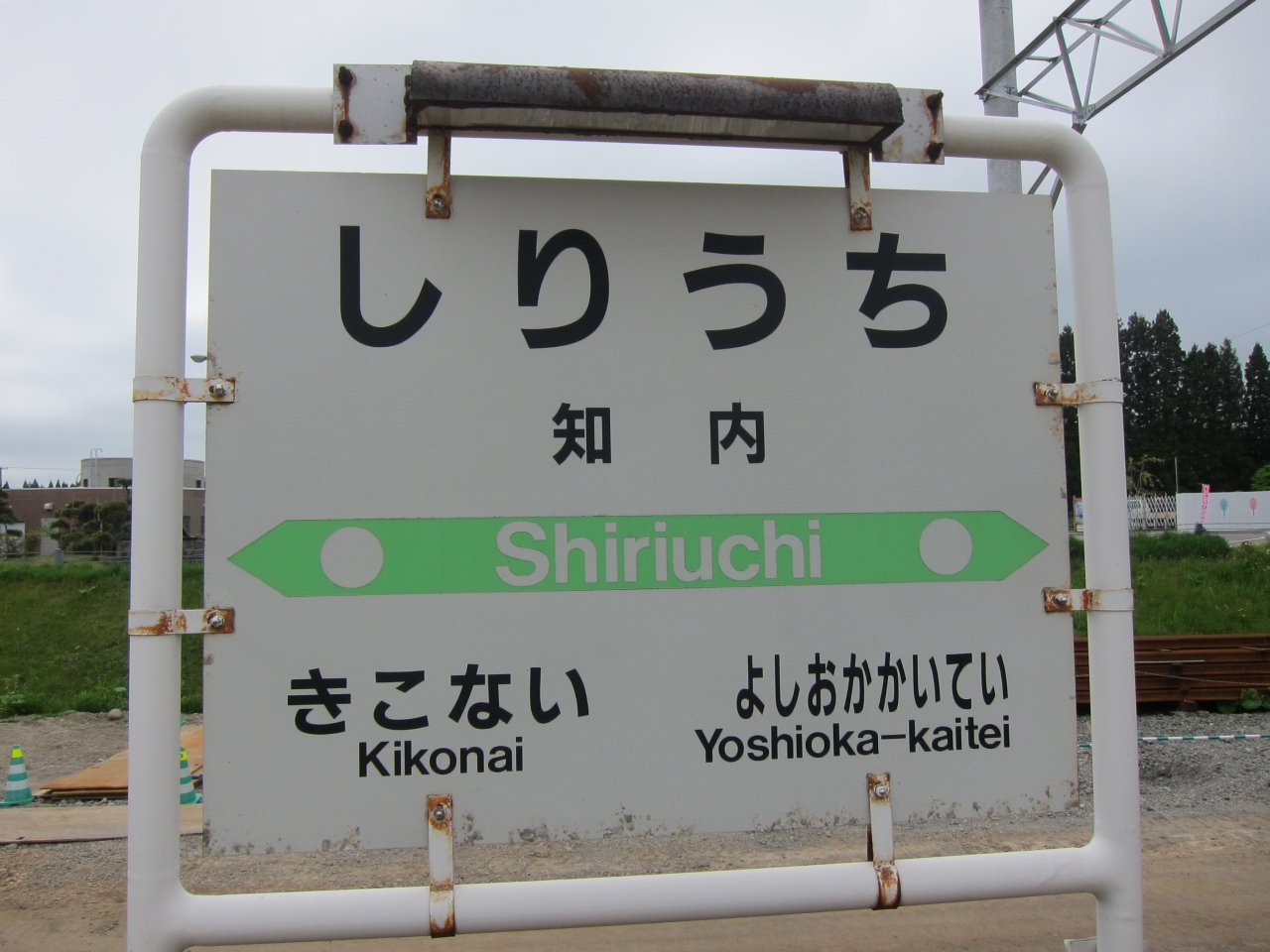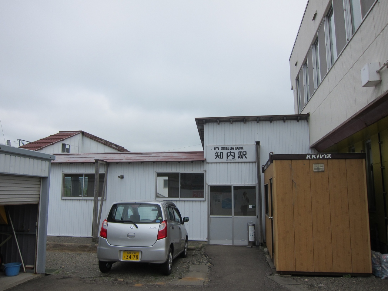外から見ると道の駅の脇に小ぢんまりとあります。道の駅の建物の裏まで回りこまないと駅名の看板が分かりません。ただ、その道の駅も貧弱です。農家の直売所みたいに地元の野菜や海産物、知内のおみやげ数点(地元の姥杉をテーマにしたまんじゅう、かみなりせんべい、ニラクッキーなど)、お菓子などの簡単な食品を売っていました。