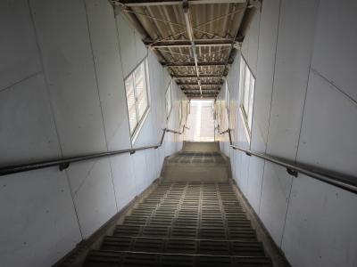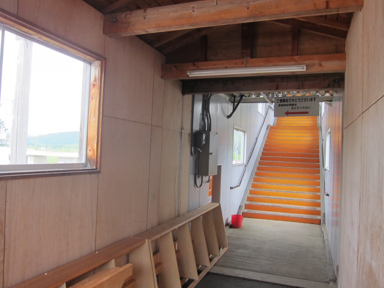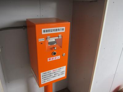 知内駅は無人駅で跨線橋を渡ったところに乗車証の自動発行機があります。駅名と日付に発行番号が印字された程度の、バスの整理券みたいな簡単な証明書がボタンを押すと発行されます。跨線橋は道の駅の建物とつながっているのですが、その手前の扉から外に出ます。