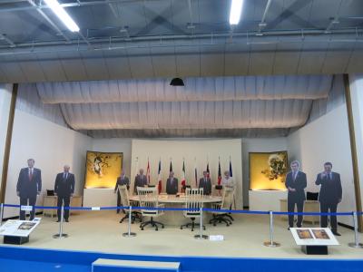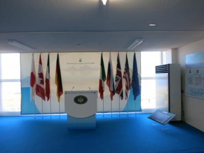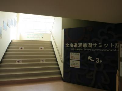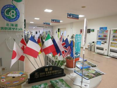 洞爺湖のバスターミナルの上がサミット記念館です。1階がバスの待合室や切符売り場。一旦、建物外へ出て上がりますが、2階が観光協会、3階がサミット記念館です。無料の施設です。バス待ちの合間に行ってみるとよいと思います。1階の待合室とは一転して整った環境です。サミットの会場はウィンザーホテルでしたが、会場を模したテーブルや会見場、晩餐会の様子などのパネル展示がありました。出席した世界の首脳の人型パネルがあり、今でも現役の人もいますが、懐かしい顔ぶれもありました(特に日本)。