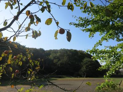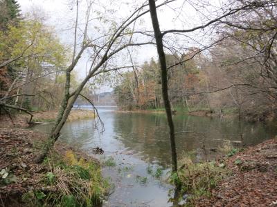 紅(黄)葉の丘を背景に、池の水は晴れた青空を映して青く照り輝き、居並ぶ立ち枯れの木々の一群はわずかに寂寥感を感じさせます。