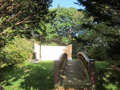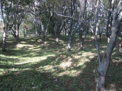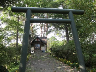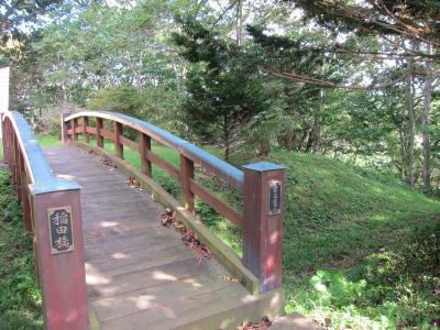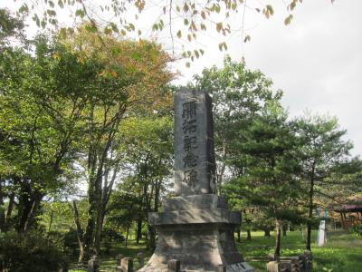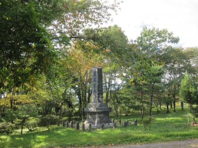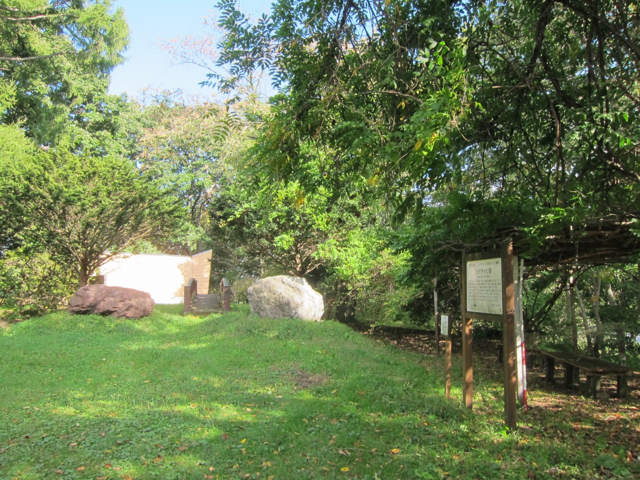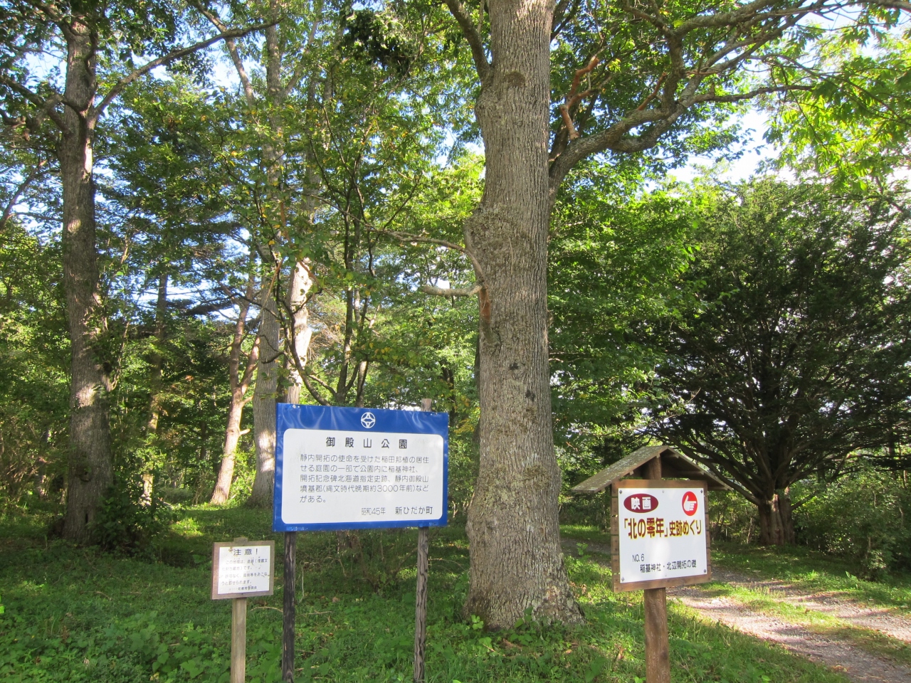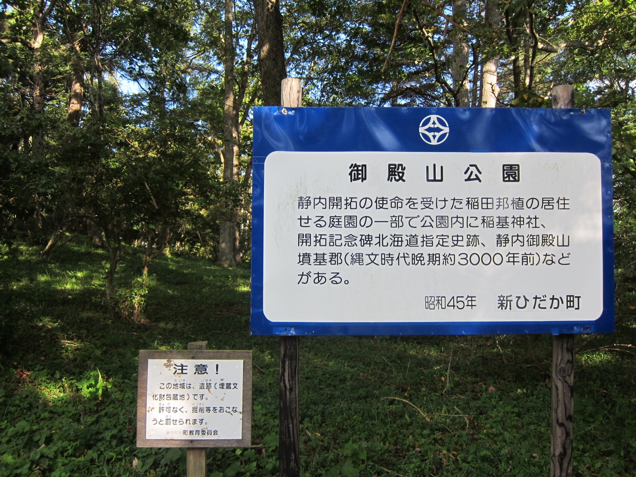 アイヌの有力者であるオニビシの砦跡(メナチャシ)、縄文時代の墳墓が残る御殿山墳墓群、明治初期に静内を開拓した稲田氏の祖霊社、稲基神社、そして稲田氏を初めとする静内の開拓を記念する北辺開拓の礎(開拓の歴史を刻んだレリーフ)などがあります。麓に稲田氏の邸宅があったそうで、御殿山はその庭園の一部だったそうです。砦があっただけに公園は標高20mくらいの丘の上にありますが、木が生い茂っていて、見晴らしはそれほどでもありませんでした。休日に行きましたが、公園はひっそりと静まり返り、訪れる人もいません。砦の土塁の起伏の跡などを眺めながら遠い昔に思いをはせるにはよい条件でした。