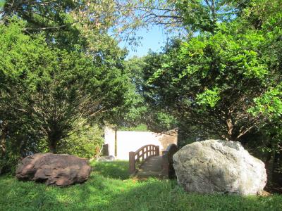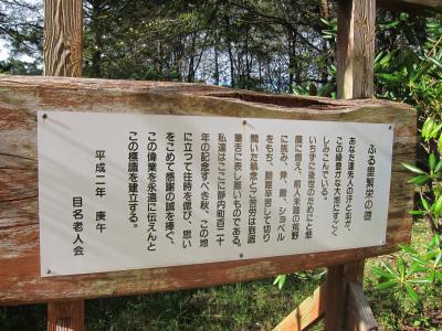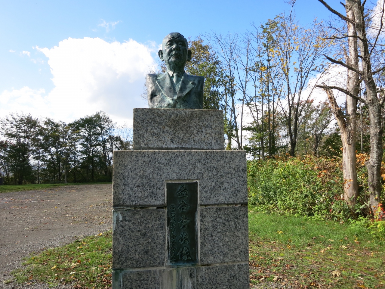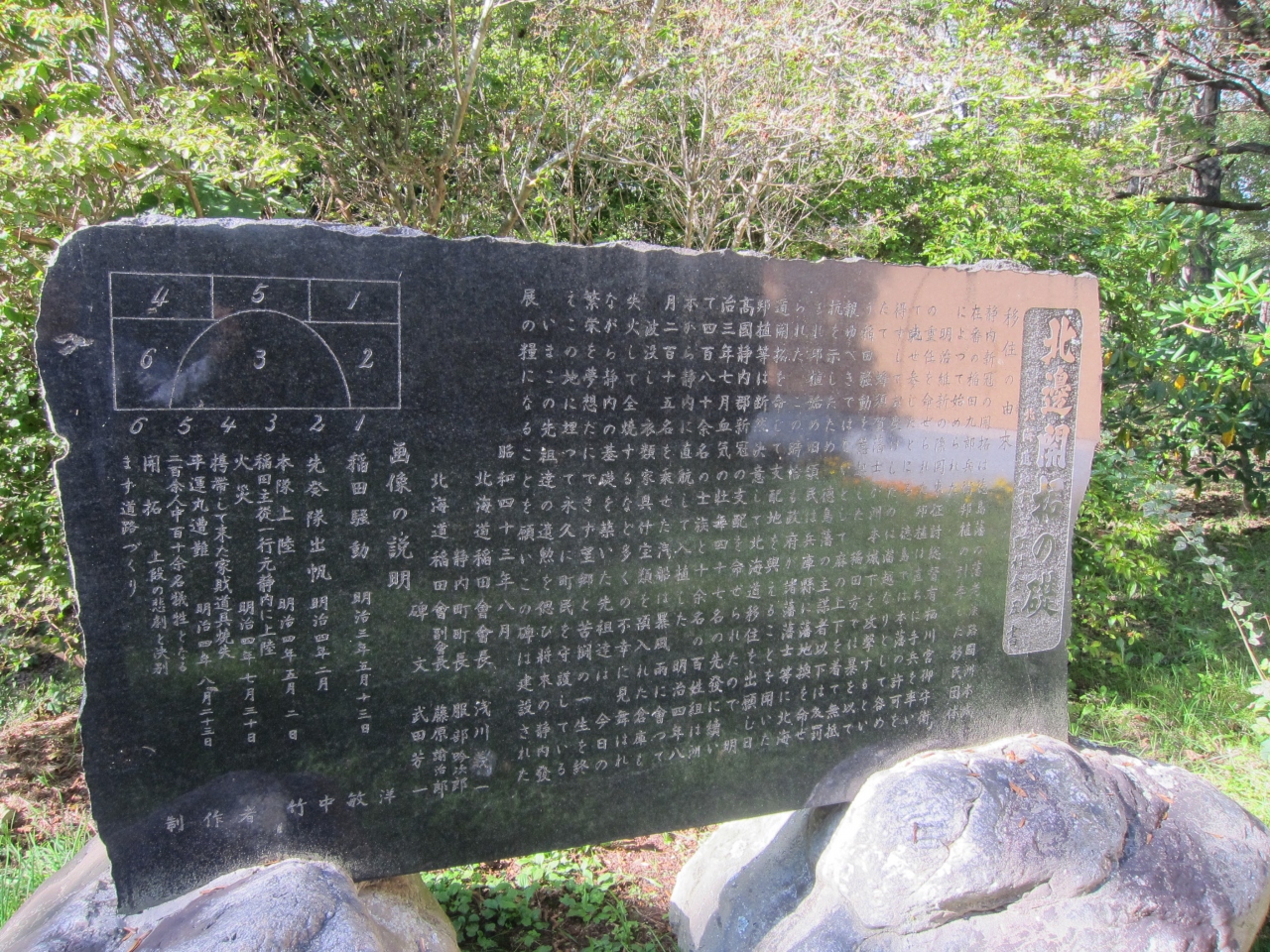 また、レリーフのある御殿山公園は稲田氏が居を構えた場所の裏山にあたる場所です。残念ながら当時の住居などは残っていませんが、道道71号線から御殿山公園へ向かう細い道の途上に、石碑があります。なお、公園は分かりにくい場所にあります。周辺は牧場やその施設、民家などになっていて、道道71号線にも案内板などもありません。民家になってしまいますが、岡田牧場の看板があるところが公園へ入っていく道です。1車線程度の細い道です。