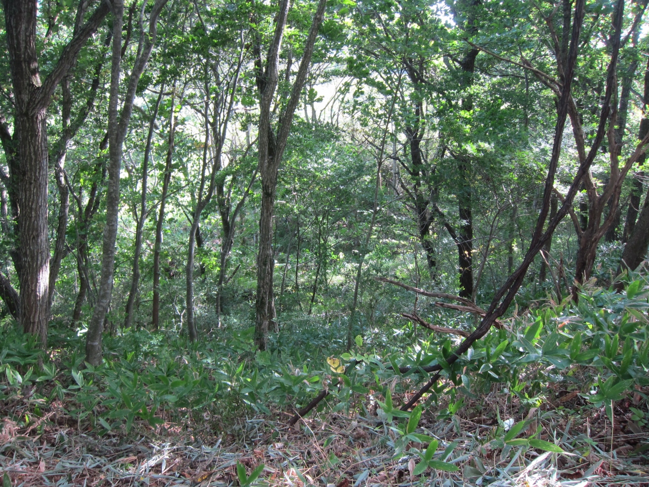 坂は石畳や石造りの階段ですが、白い漆喰の土塀や林に囲まれ陰になっています。上の方は竹林に囲まれ、石段も滑りやすくなっていました。行った時には湿っぽい場所を好むヘビに出くわしました。