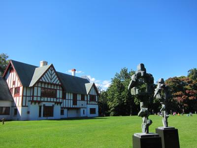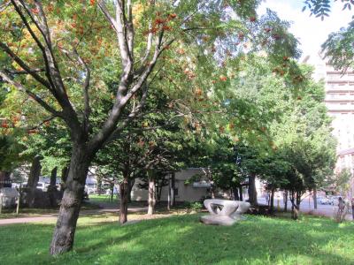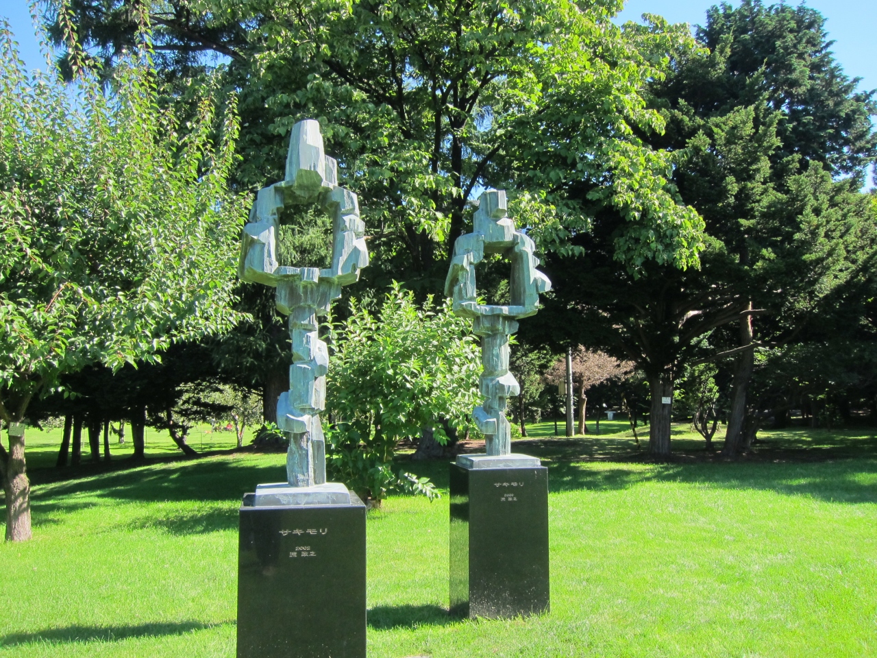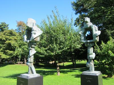 北1条西16丁目にある北海道知事公館の庭にある彫刻です。公館前の広い芝生の北東のあたりにあります。公館の建物は夏季の7/20~8/25を除いて平日しか開いていませんが、庭園は土曜・休日も入れます(開園期間:4/29~11/30・時間:8:45~17:30)。どちらも無料です。