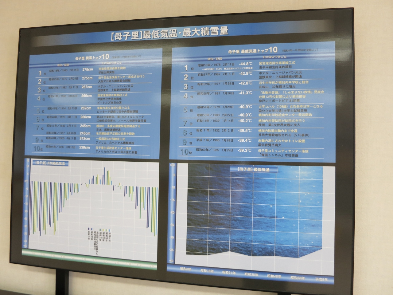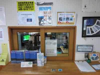 公園にはクリスタルパーク案内所があり、展示室には毎年の最低気温、気象観測装置などが展示されています。窓口でその時の気温を記載してくれる日本最寒地到達証明書を発行(\100円)してもらえるほか、最寒地にちなむオリジナルステッカー(\300円または2枚で\500円)や雪をかたどったクラフト模型(\800円)などを販売していました。食べ物類はありませんでした。
