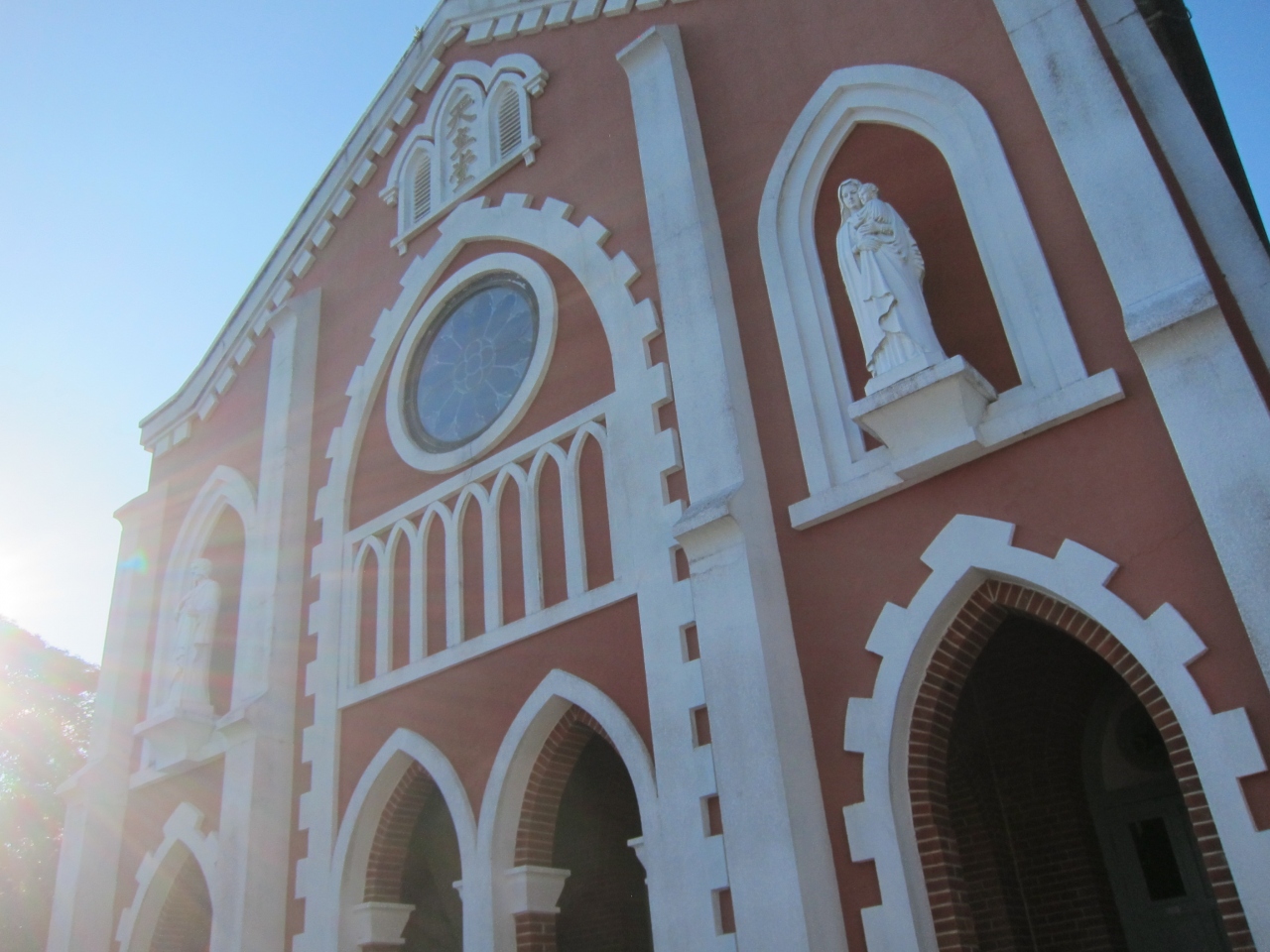 なお、教会の正面はやや東を向いているせいか、午後の光では影になってしまいます。早めの時間帯の方か見栄えが良いです。その代わりといっては何ですが、内部は午後の方が日差しが入りやすく、ステンドグラスがきれいに輝きます。