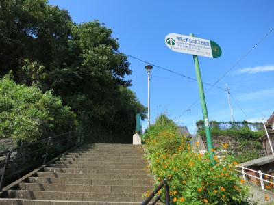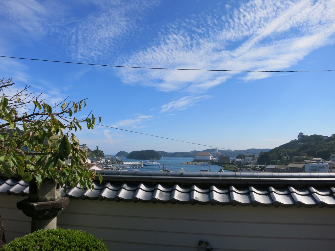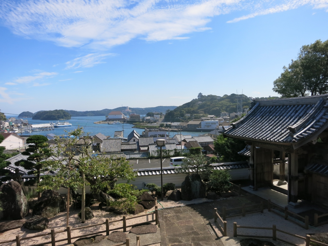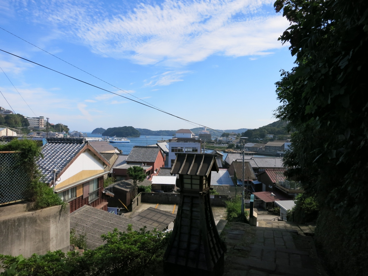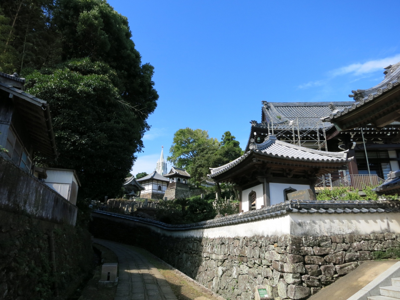 瑞雲禅寺、光明寺が並ぶ坂道の背景に聖フランシスコ・ザビエル教会の尖塔が見えます。異国情緒あふれる変わった風景です。そして振り返るとフェリーの船着場と平戸瀬戸の青い海が見えます。景色のよい場所だと思うのですが、分かりにくい細い路地を行き、階段を登らなくてはならないためか、海岸沿いの表通りに比べて観光客も少なくなります。