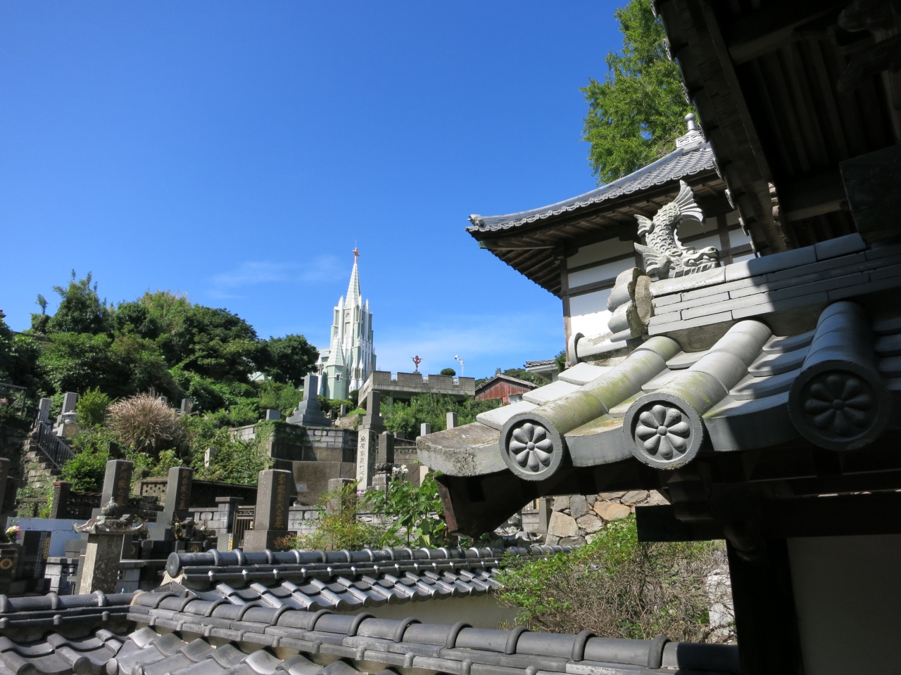 坂からは途中、瑞雲禅寺や光明寺に入っていくことができます。光明寺からも寺の建物に教会が控えるアングルが眺められます。そして坂を上がりきったところには、松浦隆信(宗陽)の墓がある正宗寺があるほか、更に進むと聖フランシスコ・ザビエル教会の裏口にたどり着きます。- 旅行時期