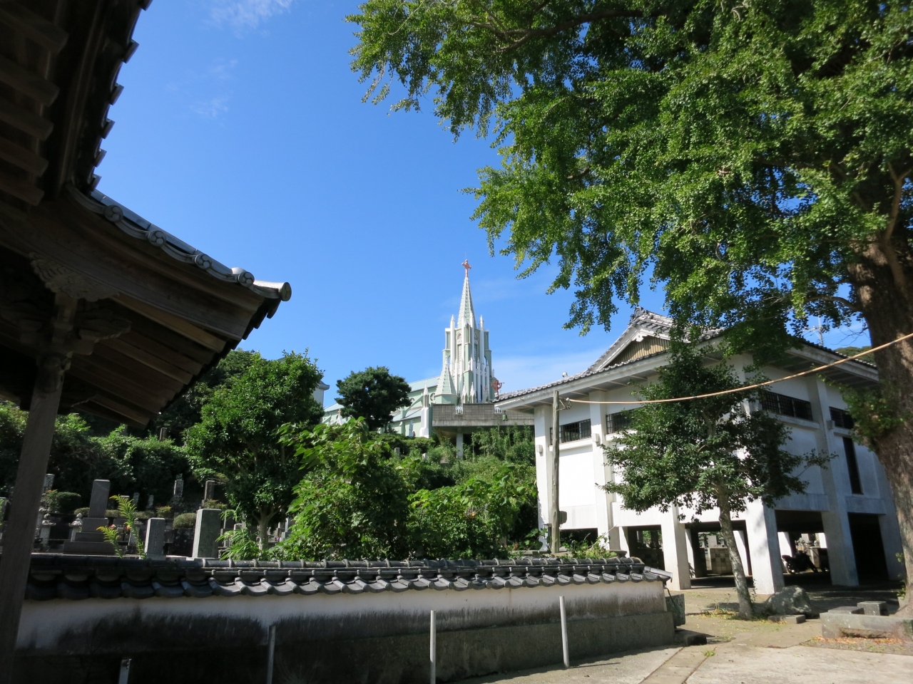 聖フランシスコ・ザビエル記念教会に隣接して光明寺や瑞雲禅寺があります。寺院と教会の見える風景として観光ポイントにもなっています。山門の方から見ると瑞雲禅寺は古くからありそうな建物ですが、行った時は、檀家の人が集まって法要をしていたり、郵便配達の人が訪れて返答がなく住職を探しに行ったりと現役の通常のお寺でもありました。